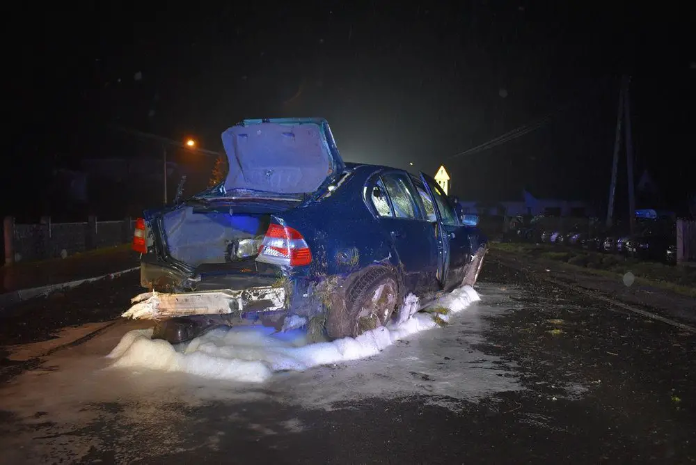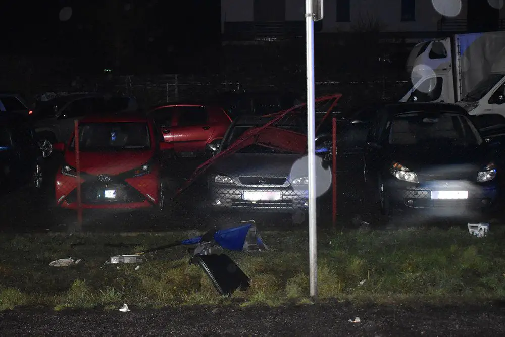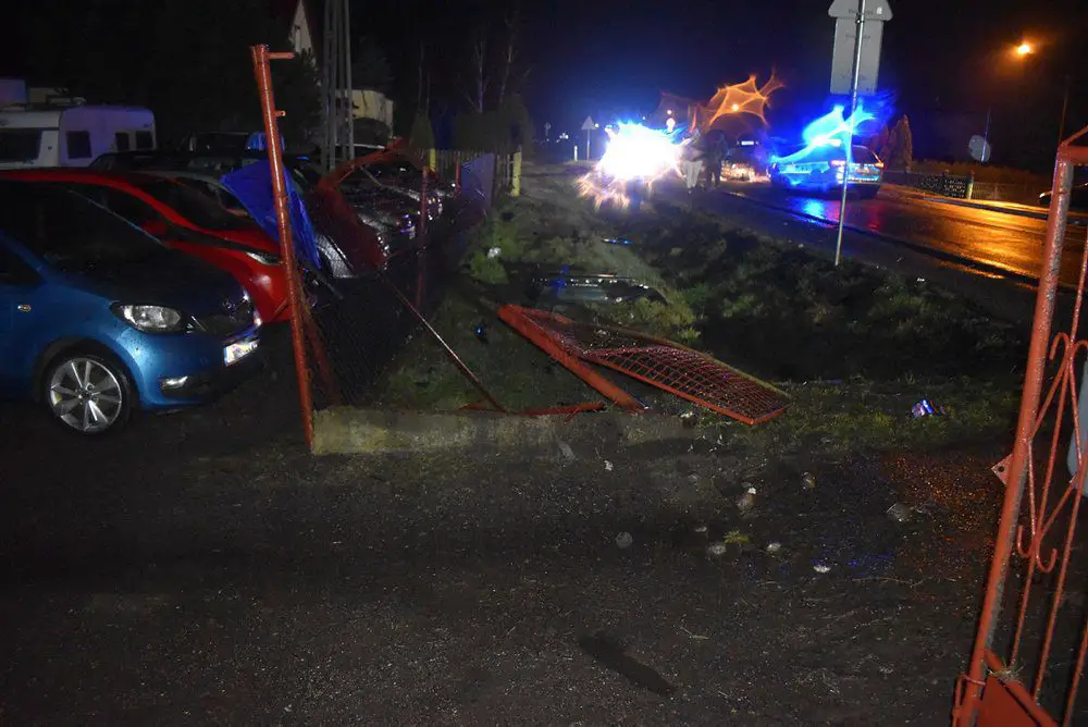 26-letni kierujący BMW stracił panowanie nad prowadzonym pojazdem w wyniku czego zjechał na lewe pobocze, następnie do przydrożnego rowu, aby z powrotem wrócić na jezdnię. Po drodze jednak zostało uszkodzone ogrodzenie posesji oraz 12 pojazdów stojących na placu.