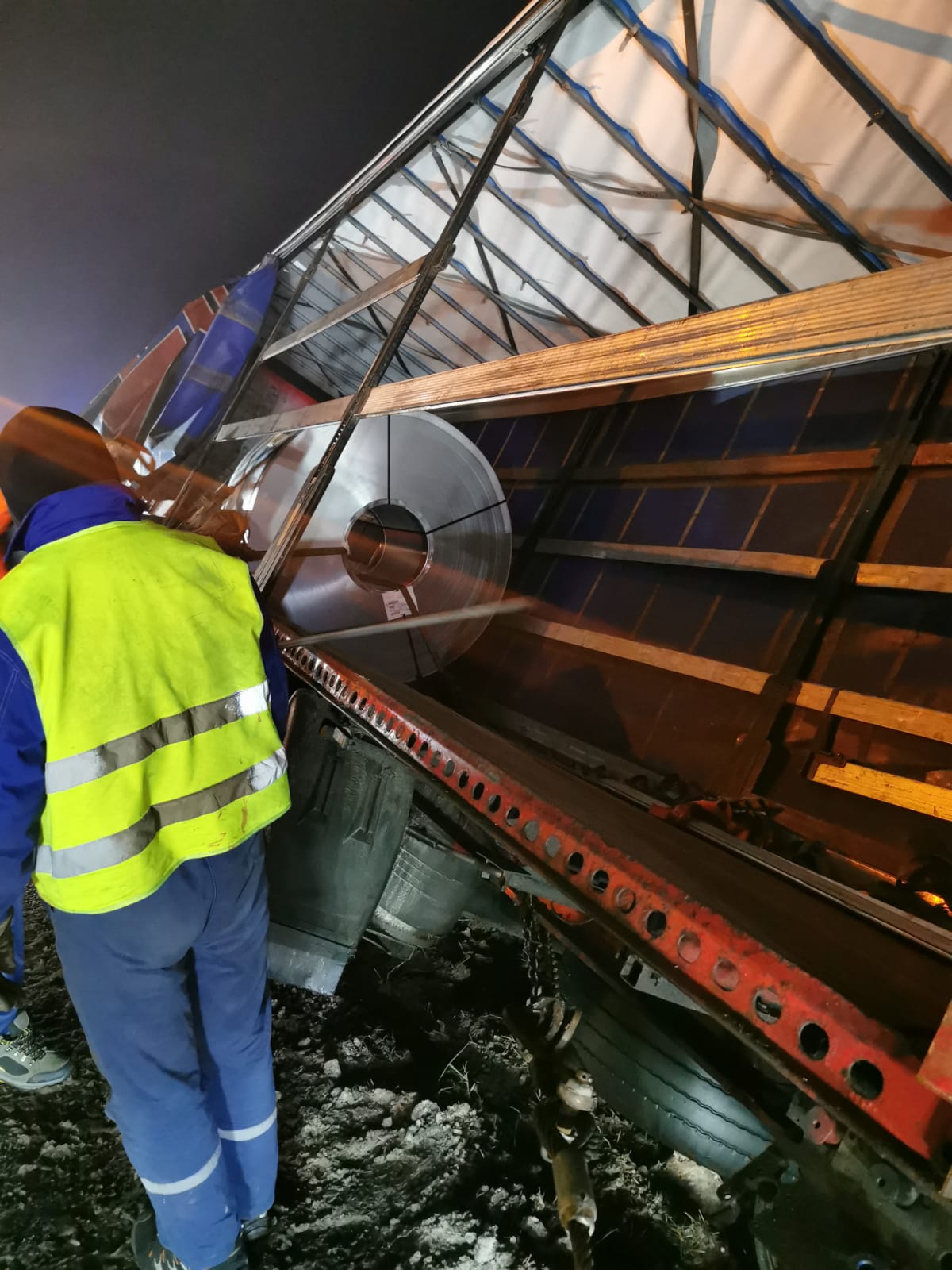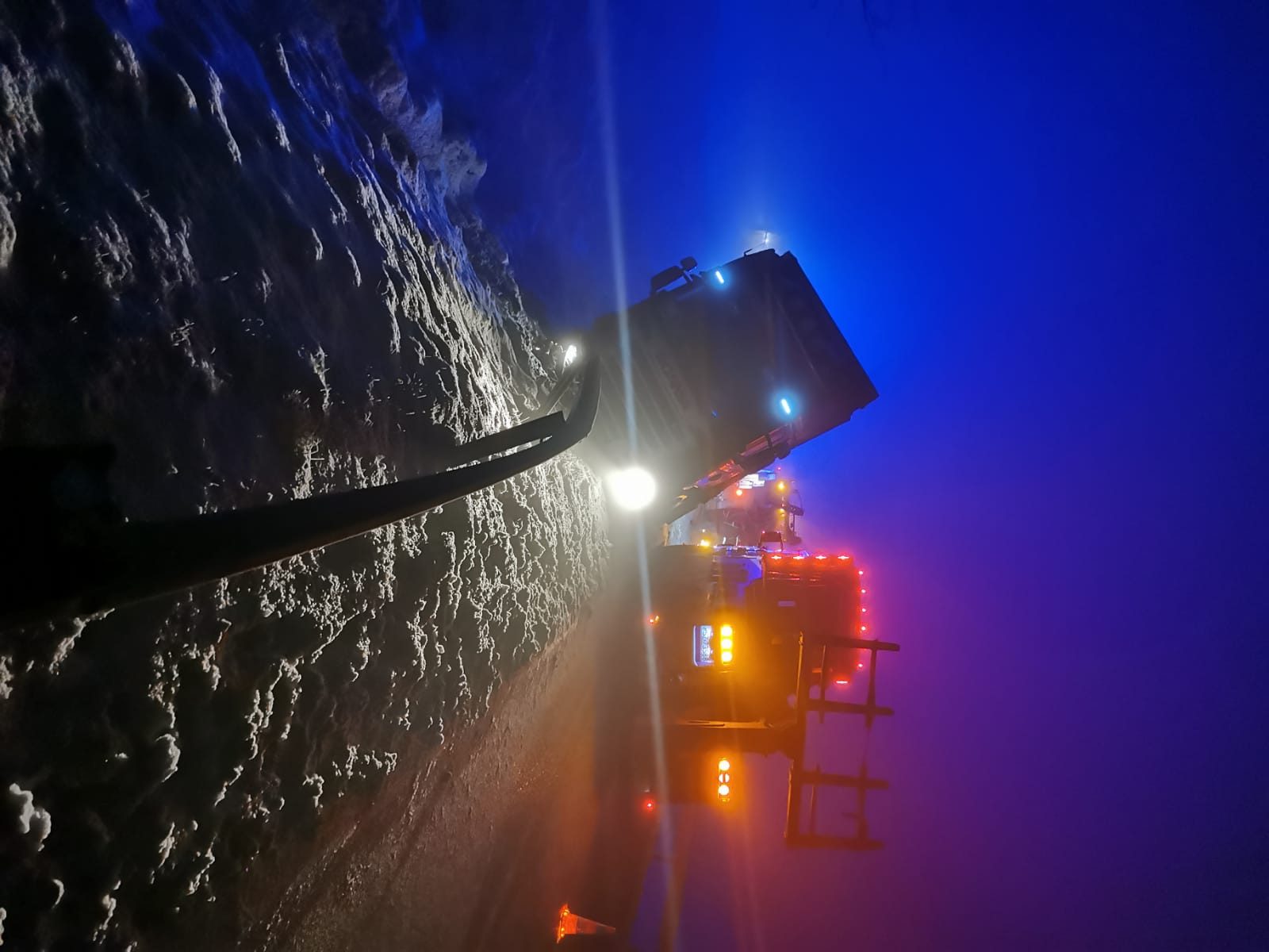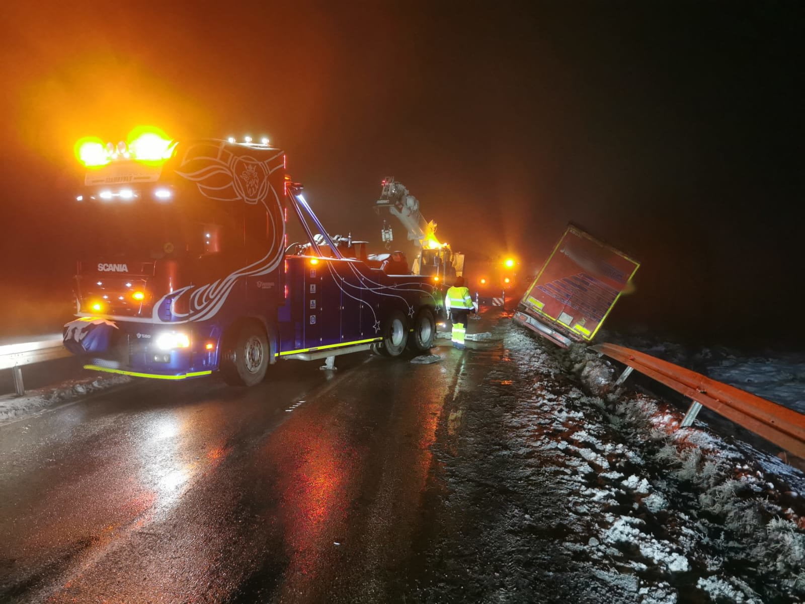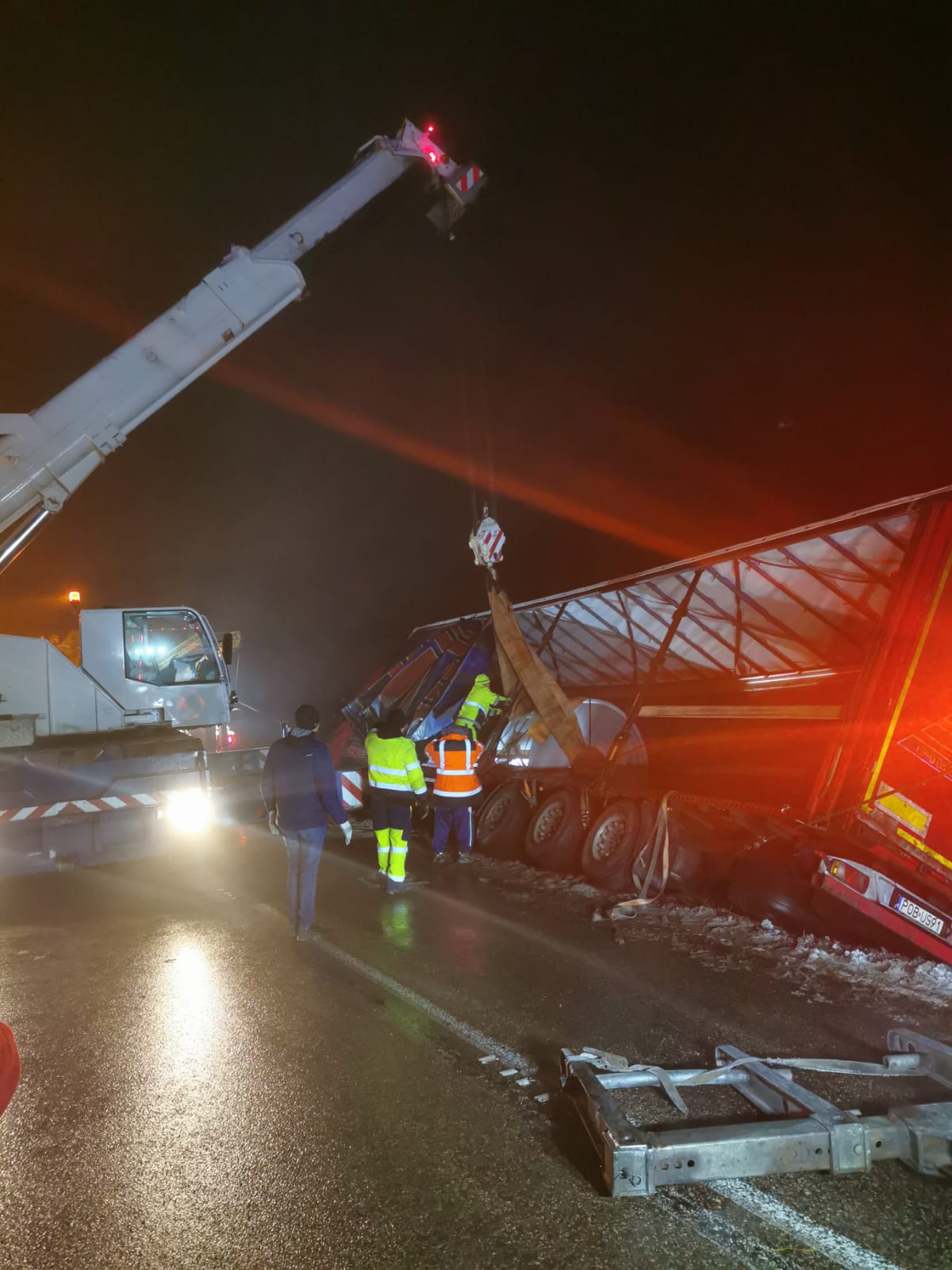 Do wyciągnięcia ciężarówki na miejsce wezwano specjalistyczny sprzęt w tym dźwig i holowniki. Na czas działań droga była całkowicie zablokowana.