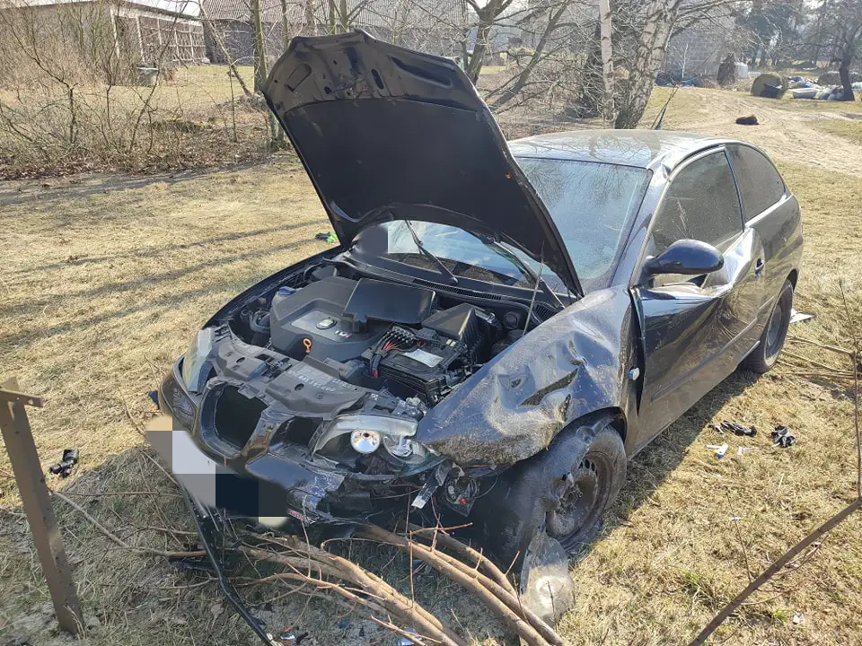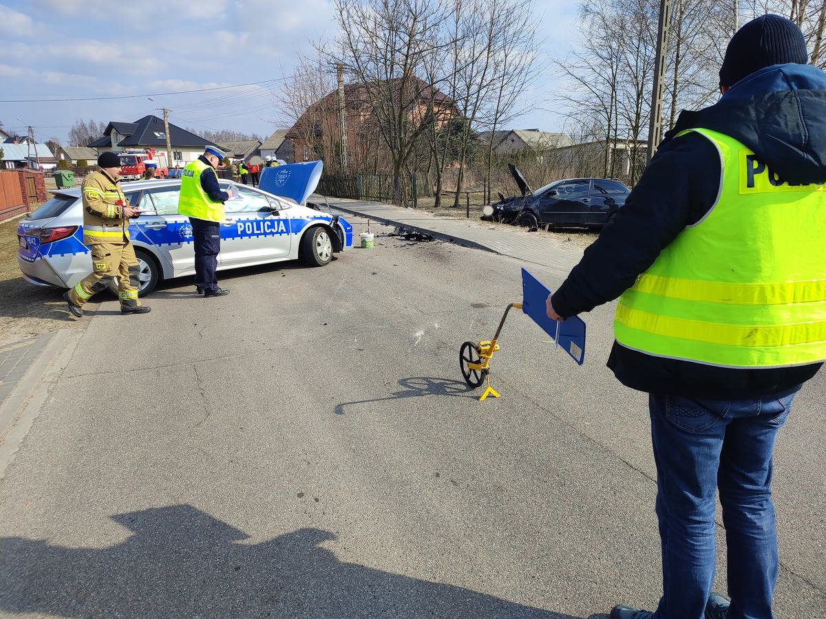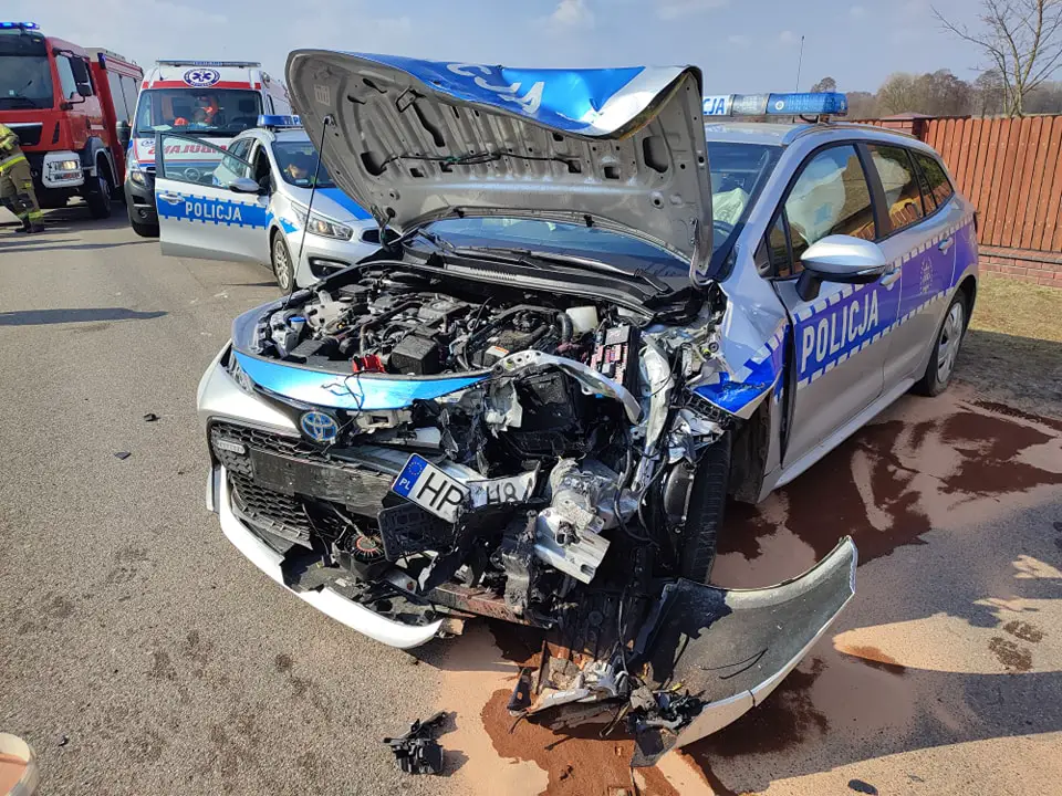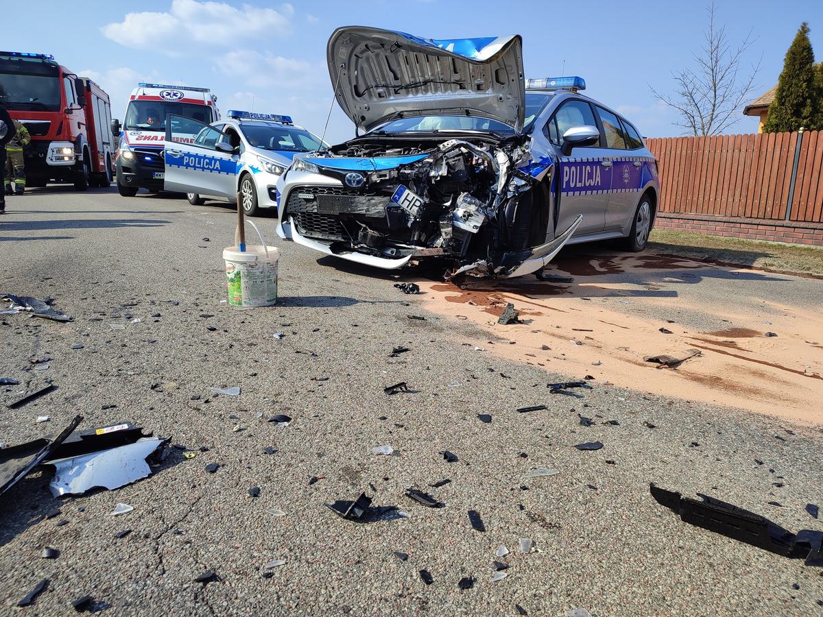 Do zdarzenia drogowego doszło około godziny 11.30 w miejscowości Komorowo. Ze wstępnych ustaleń policjantów pracujących na miejscu wynika, że 21-letni kierowca seata jadąc w stronę Rząśnika zjechał na przeciwległy pas ruchu i doprowadził do zderzenia z prawidłowo jadącym z naprzeciwka oznakowanym radiowozem uderzając w jego lewy przedni narożnik. Siła uderzenia była tak duża, że policyjny radiowóz obróciło w poprzek drogi, a seat zatrzymał się na terenie pobliskiej posesji.