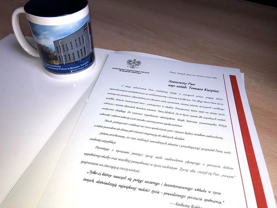 „Z okazji zakończenia Pana wieloletniej służby w szeregach policji, pragnę złożyć najserdeczniejsze podziękowania za wielowymiarową i owocną współpracę. Ten długi okres Pana życia, poświęcony państwu i obywatelom jest okresem wielu wyrzeczeń, zmiany planów życiowych i wielkiego wysiłku, którym towarzyszył stres i poświęcenie w służbie. Poświęcenie, które stało na straży życia, zdrowia i mienia obywateli, kosztem również Pana bliskich. Za to bycie razem dla wspólnych zadań, serdecznie dziękuję. Za wzorowe wypełnianie obowiązków, dzięki któremu nowotomyska Policja odnosiła i odnosi sukcesy i jest wysoko ceniona przez społeczeństwo…”