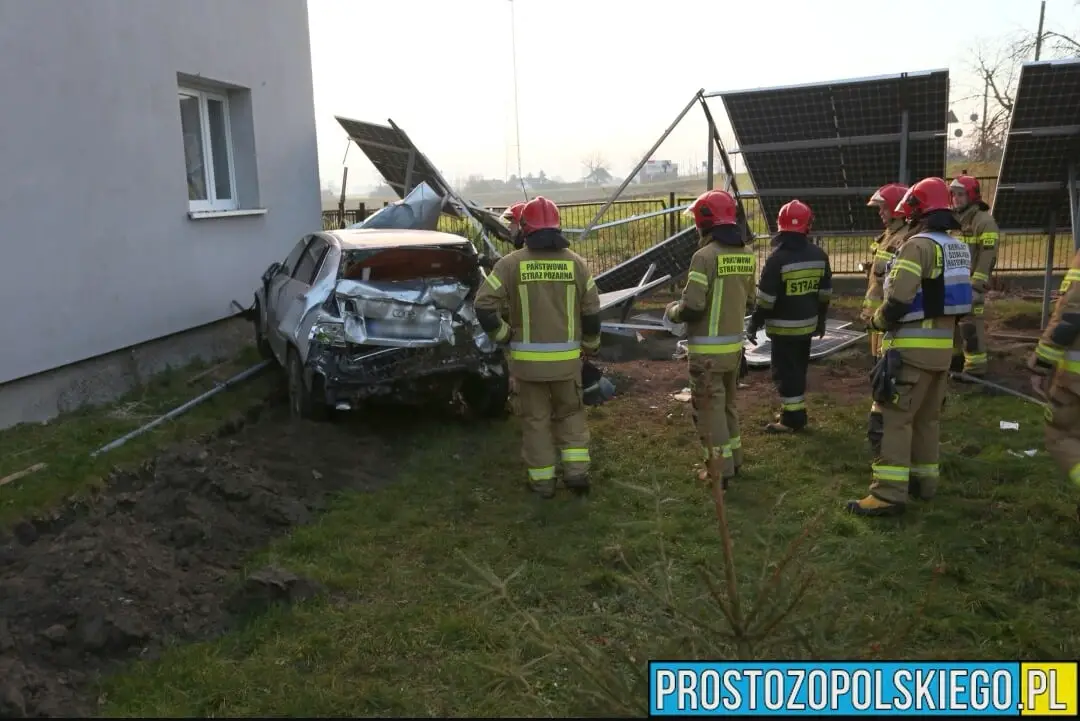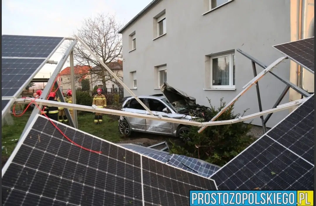 Audi prowadzone przez 26-letniego mężczyznę najpierw uderzyło w słup, po czym przeleciał przez ogrodzenie, dachował i zatrzymał się na posesji uszkodzając panele fotowoltaiczne.