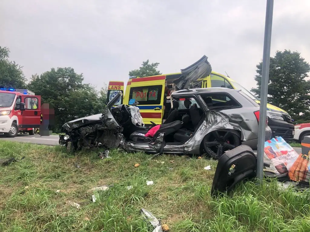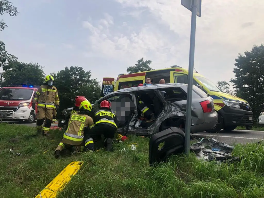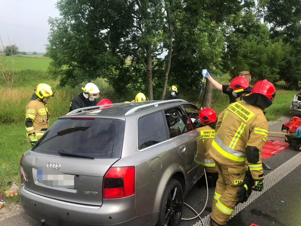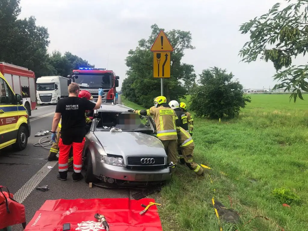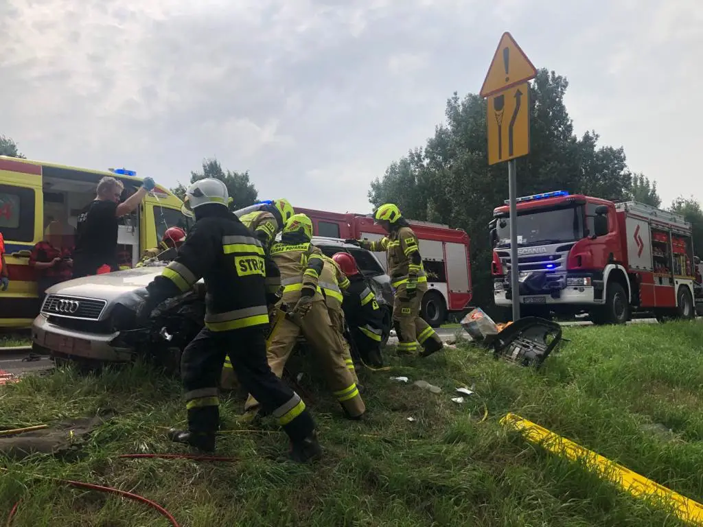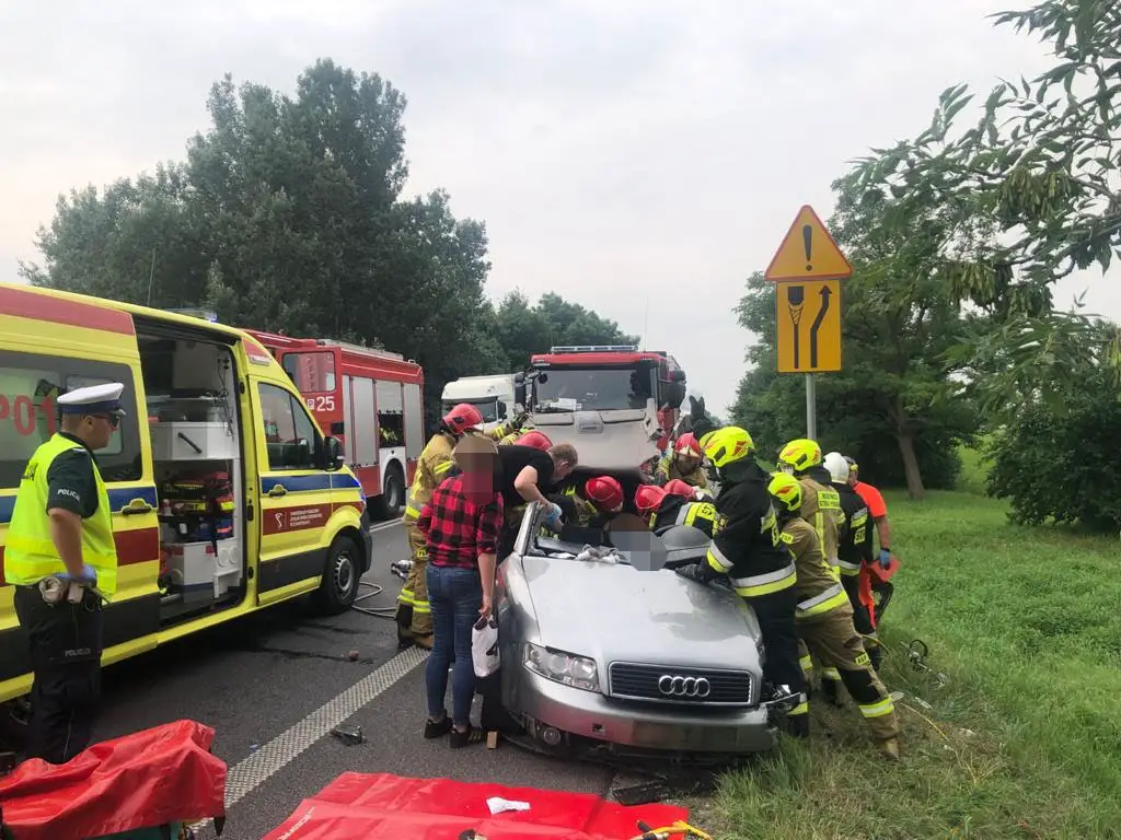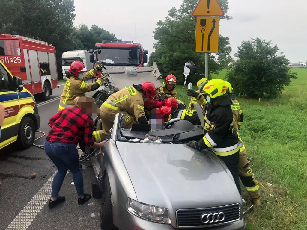 Poważny wypadek Audi z ciężarowym Volvo. 25-letni kierowca samochodu osobowego został uwięziony w pojeździe. Strażacy musieli użyć specjalistycznego sprzętu hydraulicznego by wydostać rannego mężczyznę z wraku pojazdu.