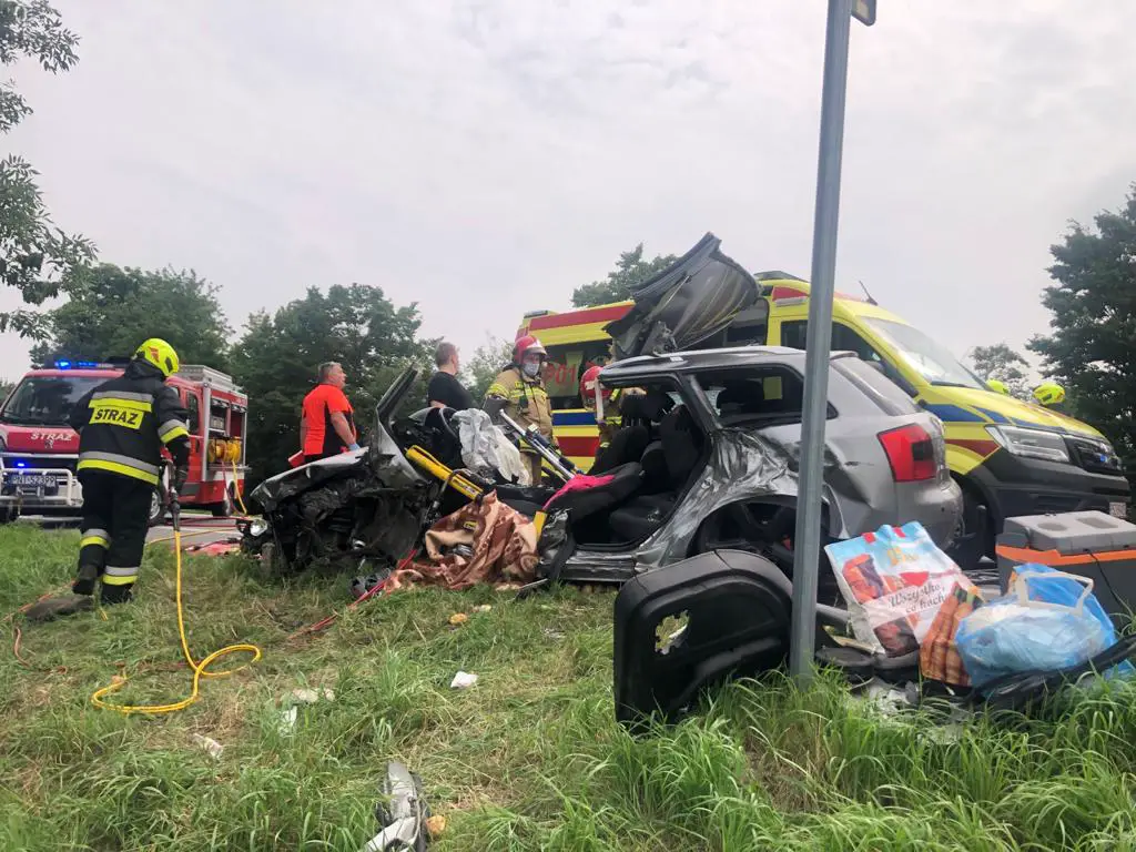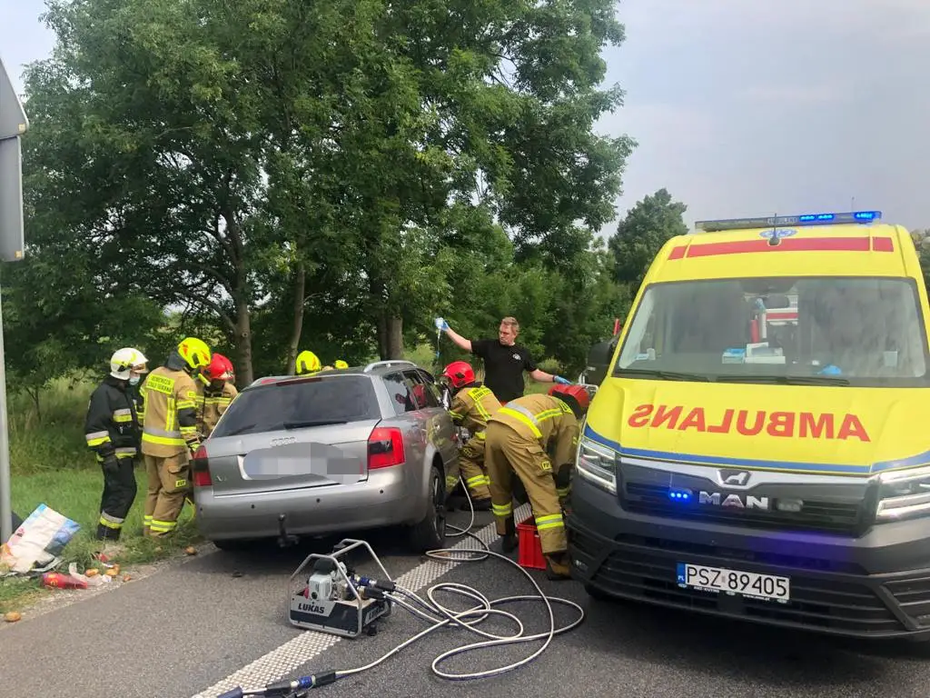Po przyjeździe pierwszego zastępu straży pożarnej na miejsca zdarzenia zastano samochód osobowy Audi A4, który po czołowym zderzeniu z ciężarówką, a wewnątrz pojazdu znajdował się uwięziony kierowca. Na miejscu działania prowadził Zespół Ratownictwa Medycznego z Pniew, który najechał na wypadek. Kierowcy samochody ciężarowego po wjechaniu do przydrożnego rowu nic się nie stało. Samochodem osobowym podróżowała również kobieta, która jako pasażer nie odniosła obrażeń