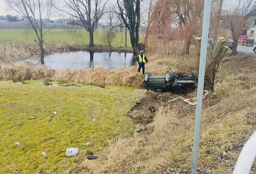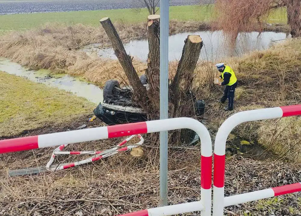 Kierujący bmw pędził. Z dużą prędkością wjeżdżał na mostek i tam wpadł w poślizg. Kierujący stracił panowanie nad samochodem, który wypadł z drogi rozbijając barierki. Bmw wypadł z mostka i dachowało uderzają w drzewo.