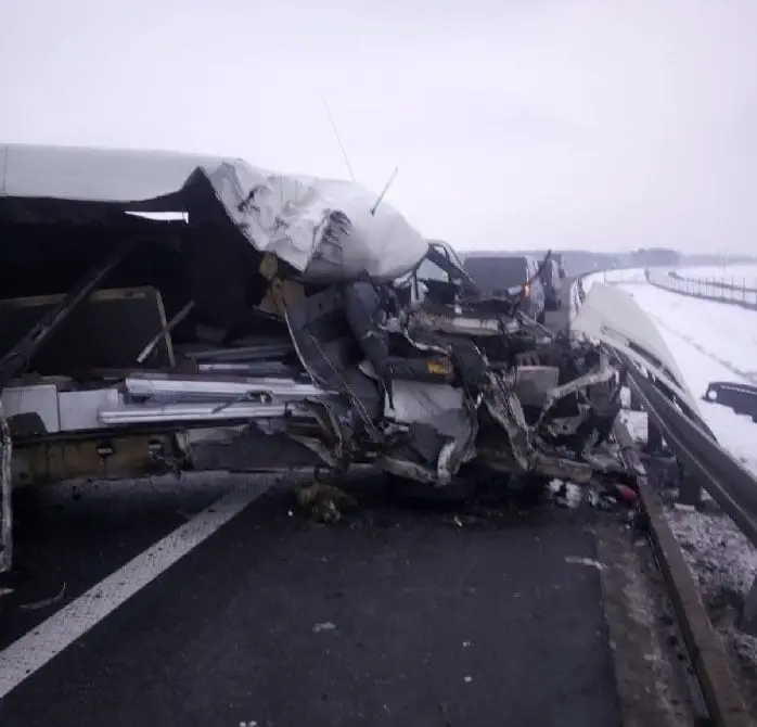 Kierowca ciężarówki zjechał na pas awaryjny w wyniku uszkodzenia koła. Siła uderzenia busa w naczepę była ogromna. Samochód został dosłownie rozerwany.