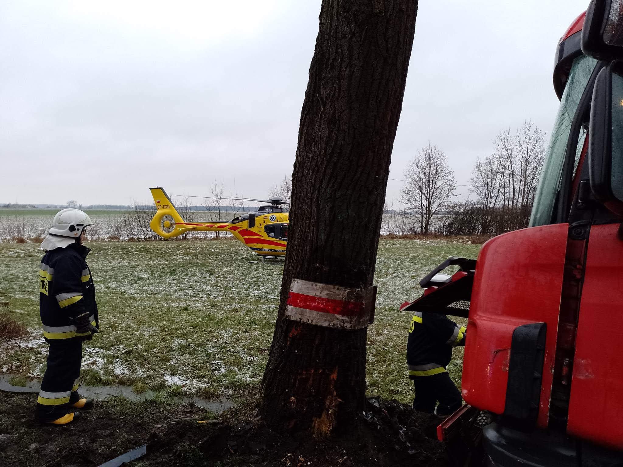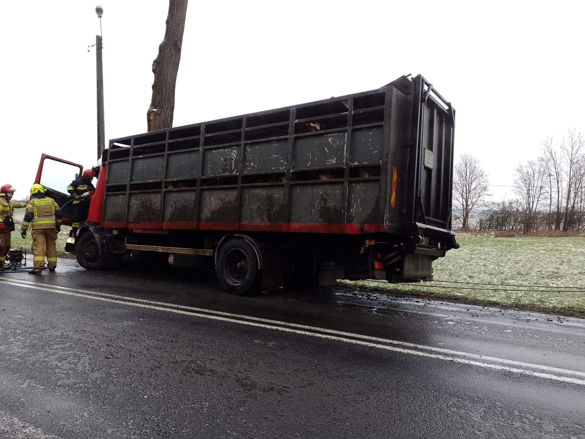 Strażacy po zabezpieczeniu terenu działań przystąpili do cięcia i rozpierania zdeformowanych elementów konstrukcyjnych pojazdu celem wykonania dostępu do poszkodowanego mężczyzny. Obecny na miejscu zespół ratownictwa medycznego stale monitorował stan przytomnego pasażera, dbając o jego komfort psychiczny. W momencie uzyskania możliwości bezpiecznej ewakuacji decyzją lekarza uczestnika zdarzenia przetransportowano do śmigłowca lotniczego pogotowia ratunkowego celem jego dalszej hospitalizacji. Równolegle na miejscu wypadku prowadzono działania związane z zabezpieczeniem przewożonych zwierząt, które zostały objęte opieką weterynaryjną i przeładowane na zastępczy środek transportu. Po zakończeniu czynności realizowanych przez funkcjonariuszy Policji z jezdni usunięto elementy karoserii samochodowej oraz wycieki płynów eksploatacyjnych stwarzające zagrożenie dla pojazdów kołowych. Czynności te zrealizowano za pomocą sorbentu oraz podręcznego sprzętu burzącego. Zdeformowany pojazd z miejsca wypadku został zabrany przez pomoc drogową.