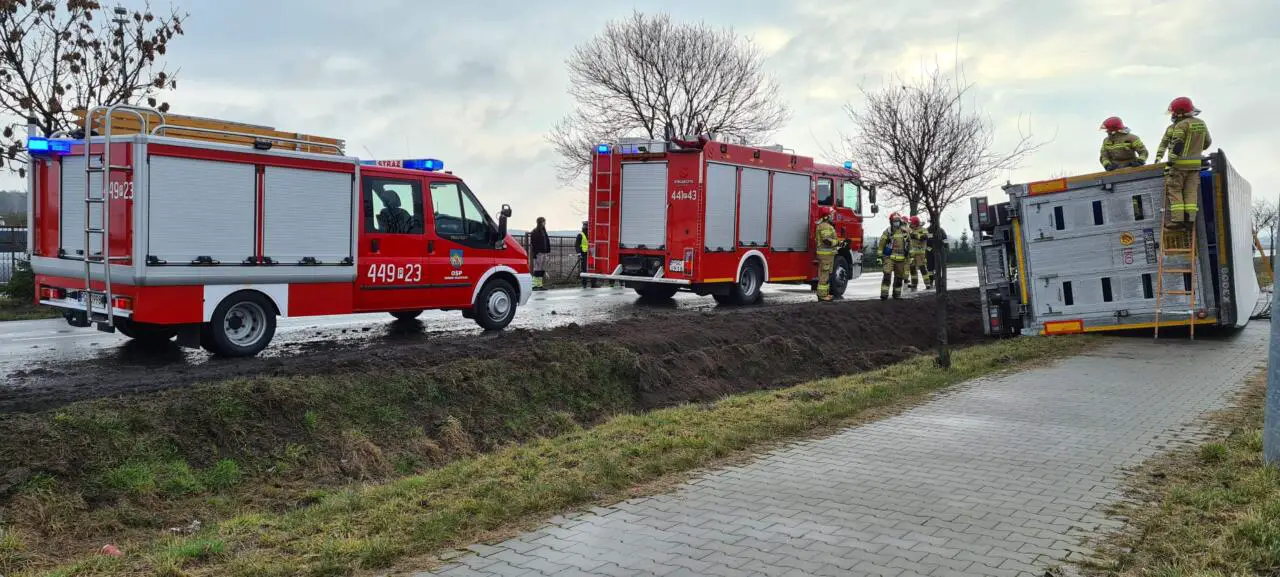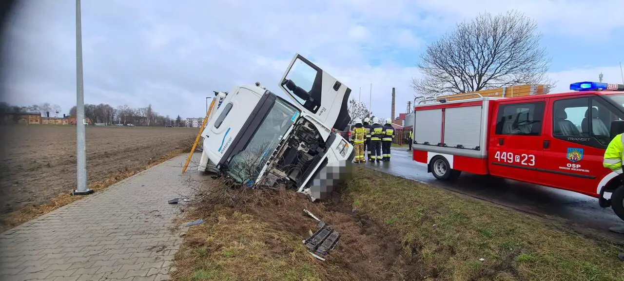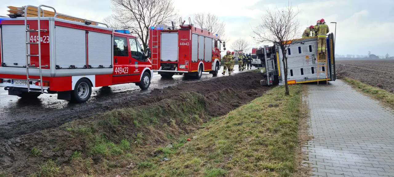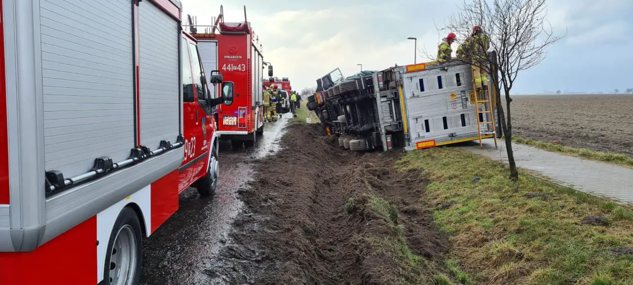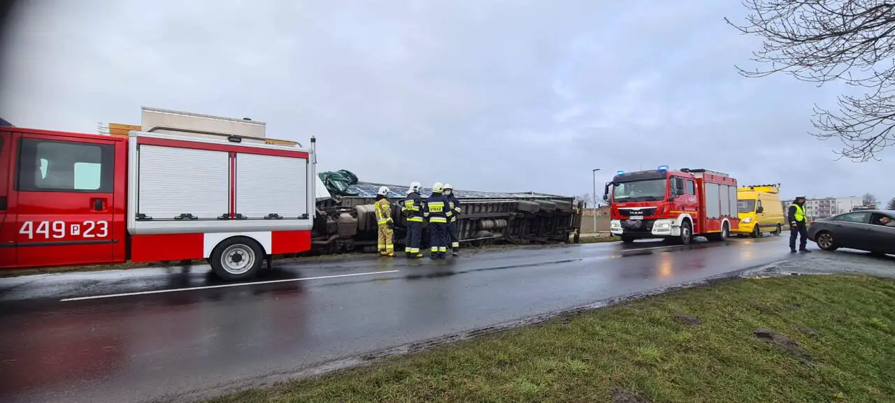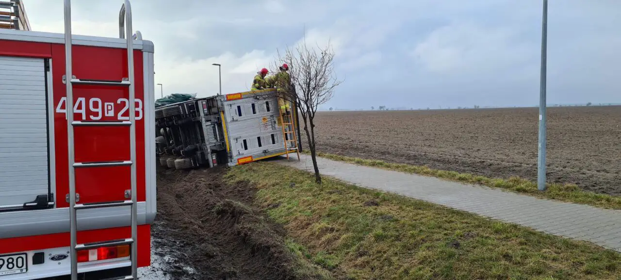 Dyżurny Grodziskich strażaków, w środę 17 marca odebrał zgłoszenie, o przewróconej ciężarówce na trasie Grodzisk Wielkopolski – Wielichowo.