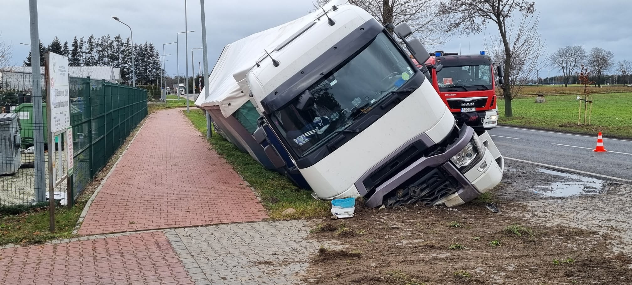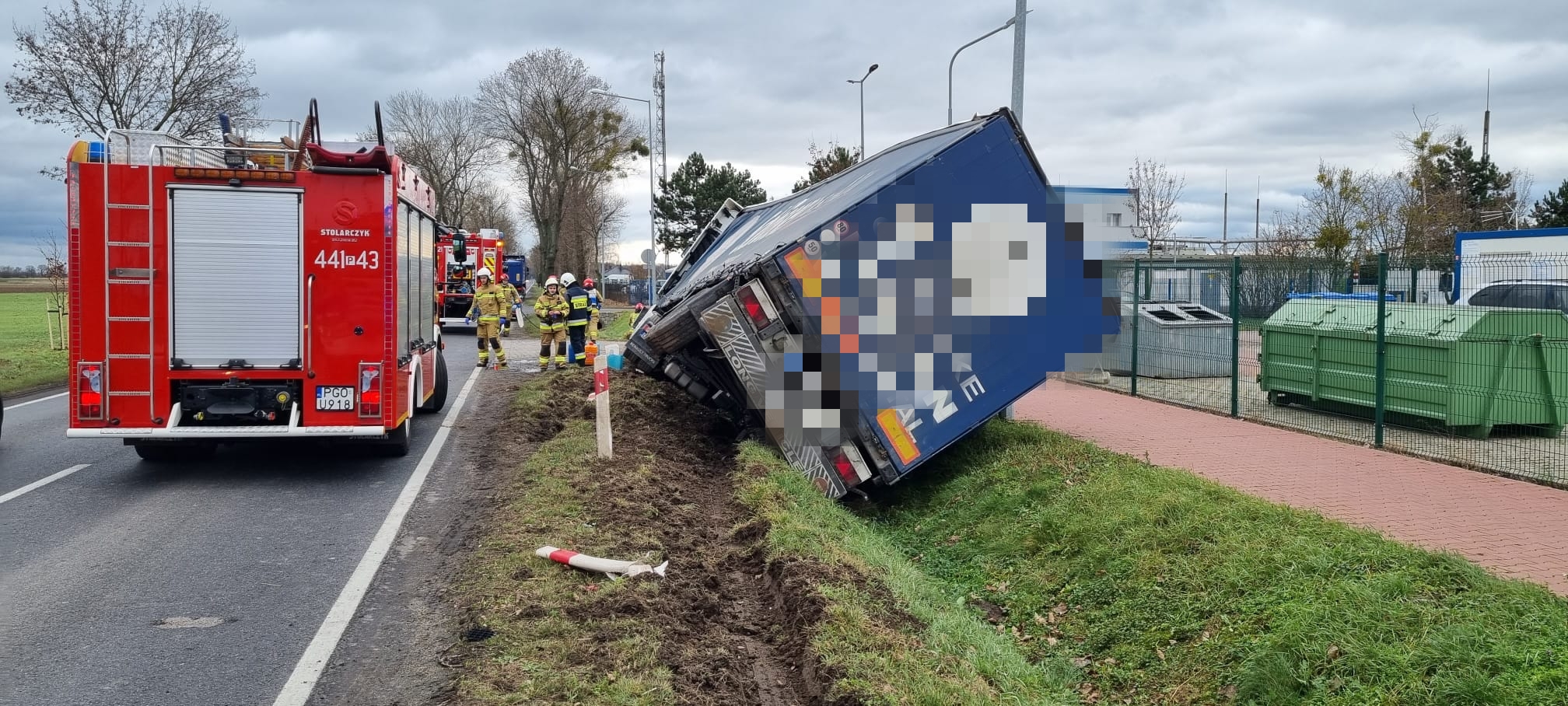 Na miejsce natychmiast zadysponowano strażaków zawodowych z Jednostki Ratowniczo-Gaśniczej z Grodziska Wielkopolskiego, policję oraz zespół ratownictwa medycznego. Po dojeździe na miejsce pierwszych służb zastano samochodów ciężarowych, który zjechał z drogi, wpadł do rowu i przewrócił się na bok. Po decyzji kierującego działaniami na miejsce zadysponowano jeszcze strażaków ochotników z Grodziska Wielkopolskiego.