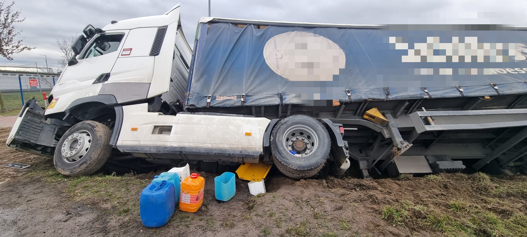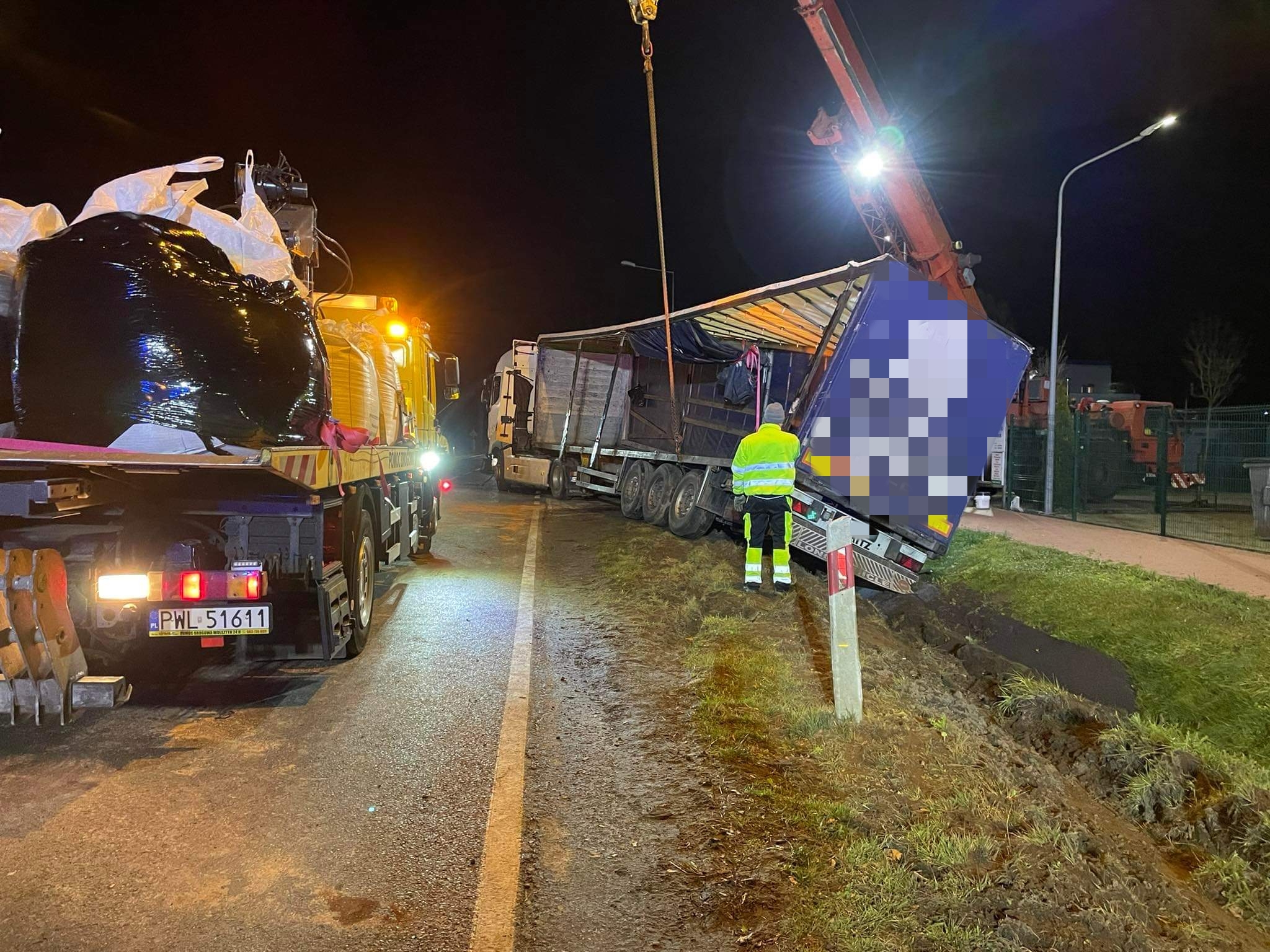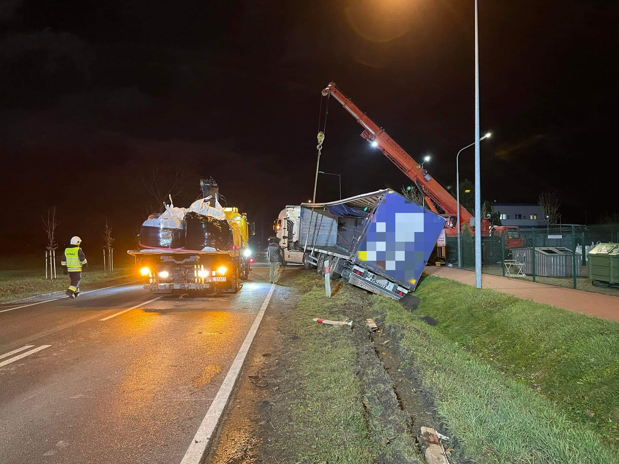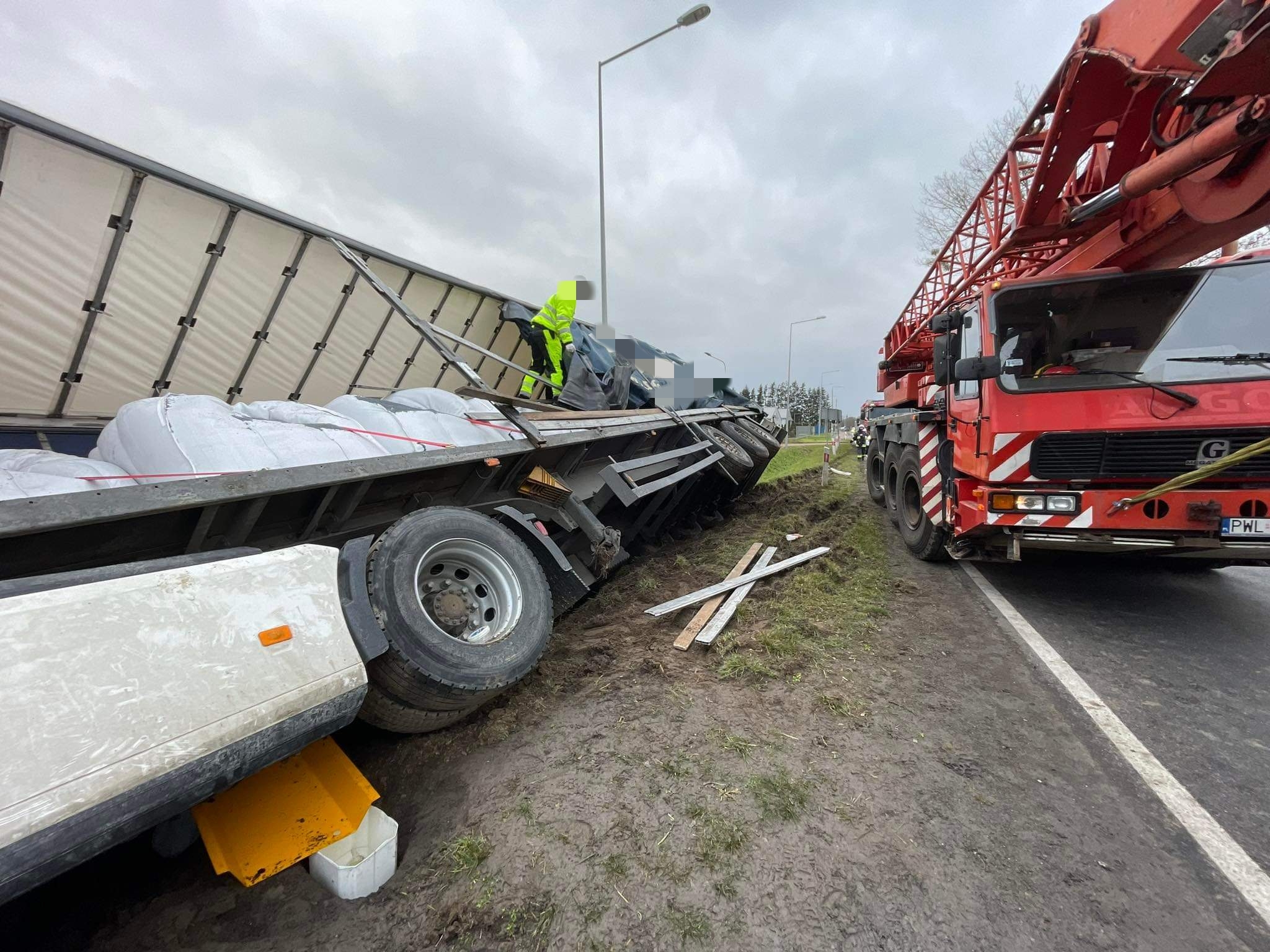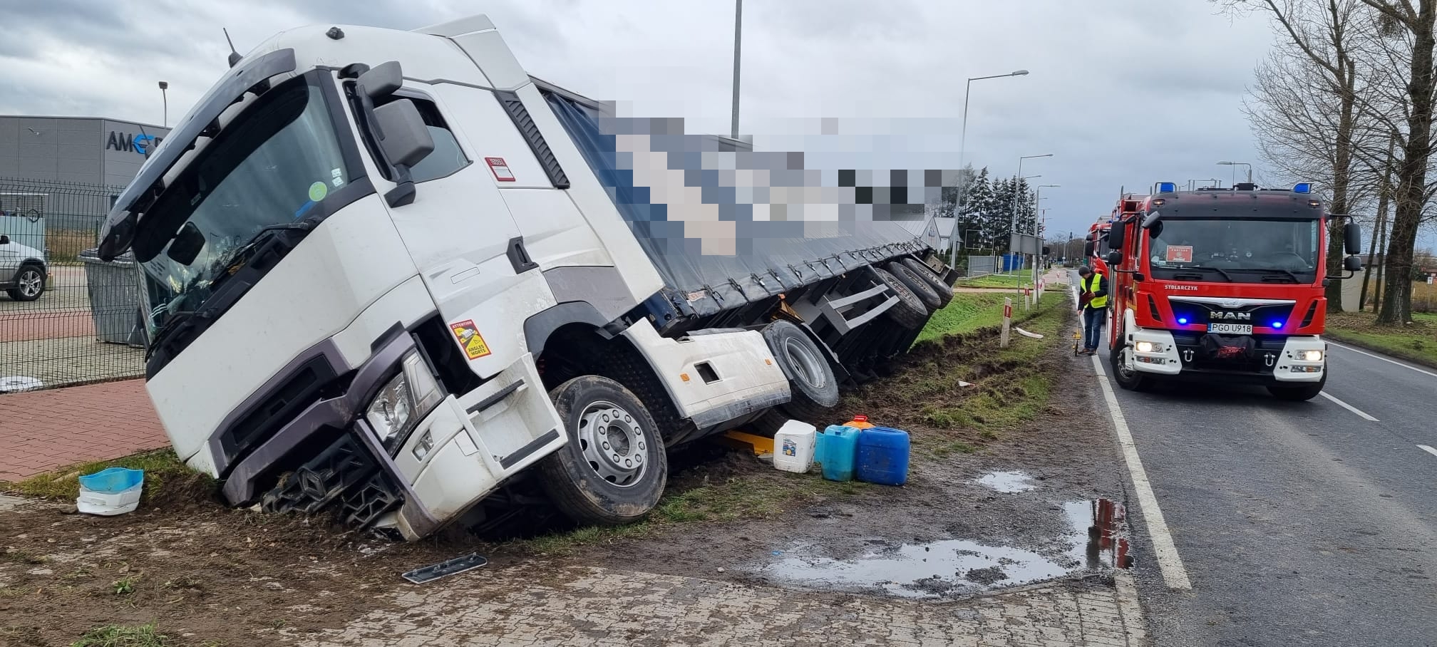Wiadomo, że w chwili przyjazdu strażaków 55-latek znajdował się poza pojazdem. Ładunek, który był przewożony był to granulat gumowy, który znajdował się w bigbagach.