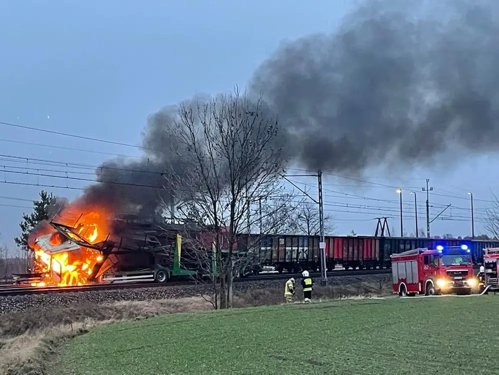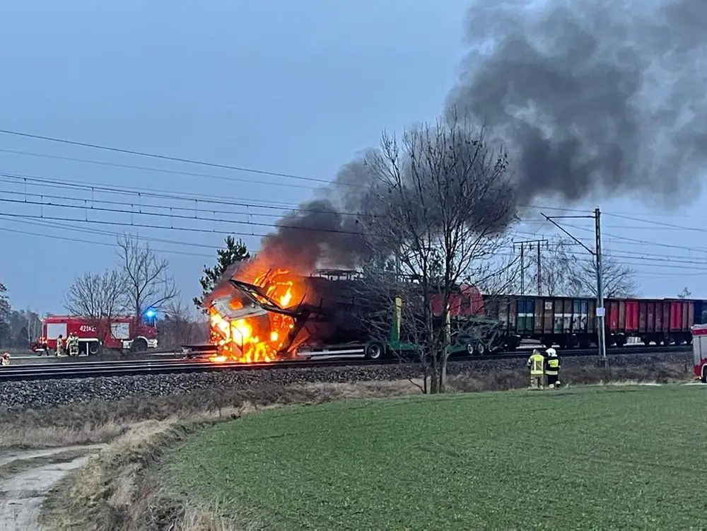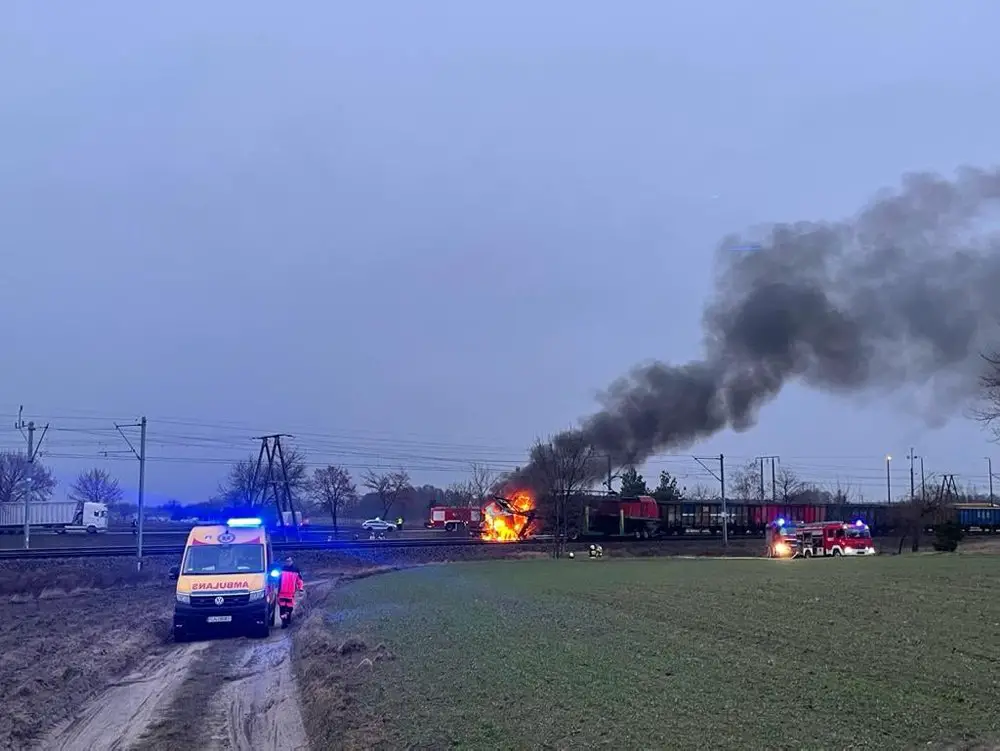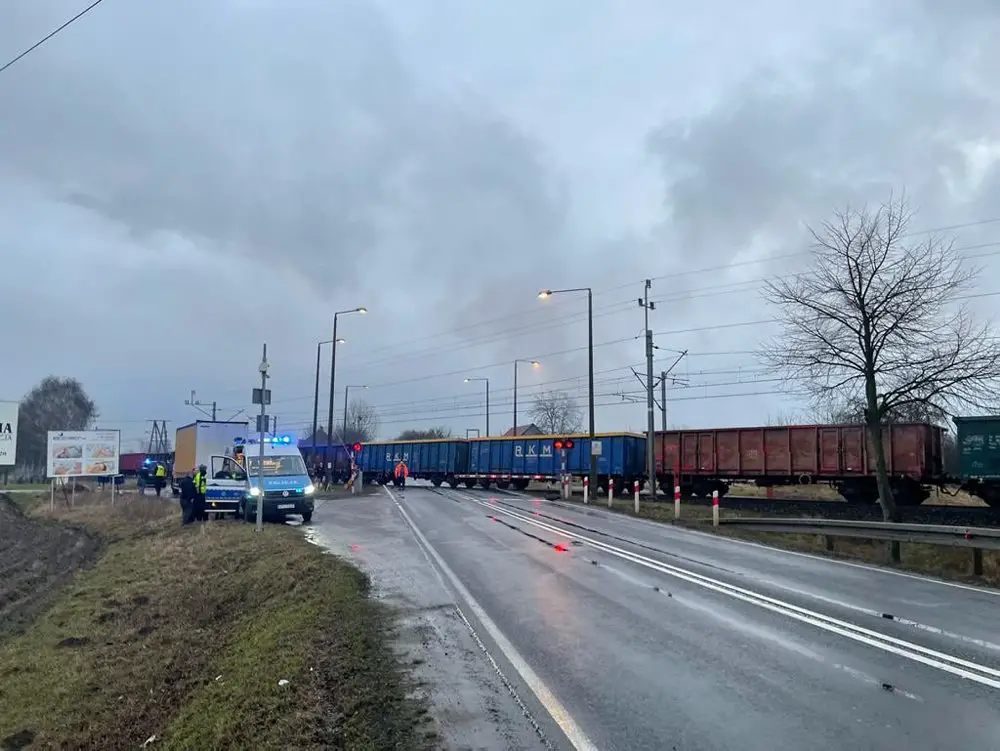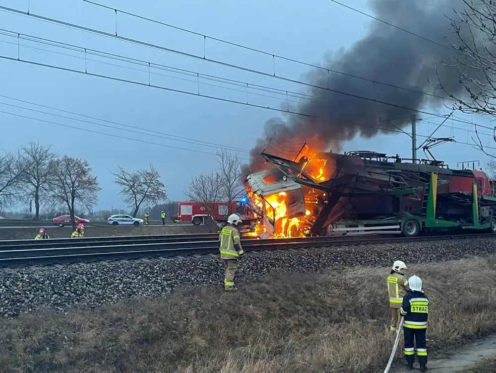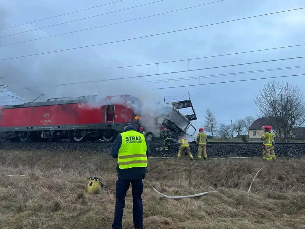 Samochód ciężarowy wjechał pod pociąg na przejeździe kolejowym w miejscowości Wymysłowo koło Gniezna na drodze krajowej numer 15. Pociąg jajo samochód się zapalił, doszło do wybuchu. Na miejscu pracują już służby ratunkowe.