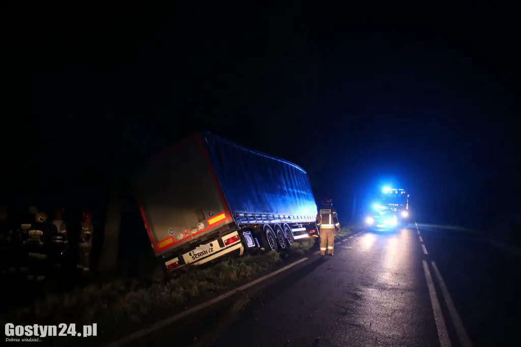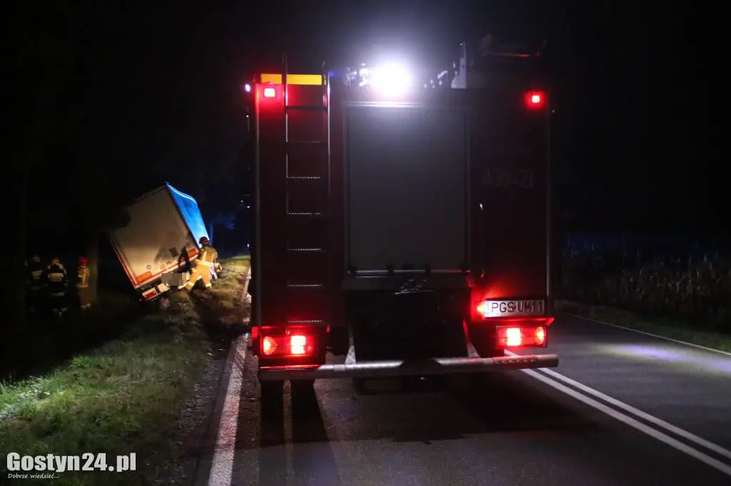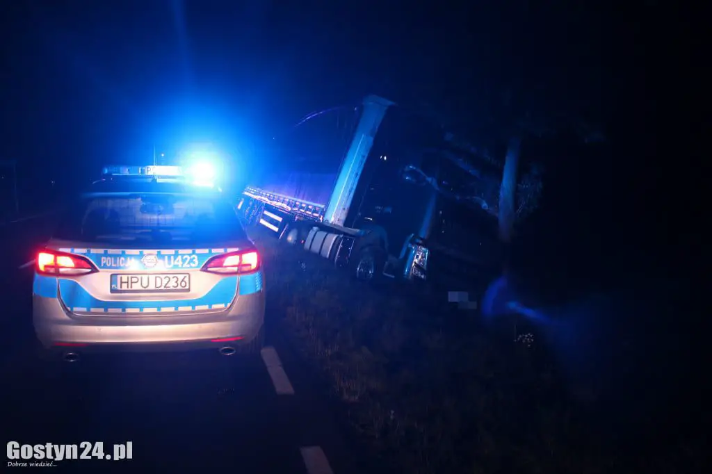 Ciężarówka jechała z Rawicza w kierunku Krobi. W pewnym momencie kierowca zjechał na przeciwległy pas ruchu, i uderzył w drzewo. Naczepą uderzyła w dwa drzewa. Tylko dzięki temu ciężarówka nie przewróciła się. Kierowca sam wysiadł z kabiny. Jechał do zakładu w Pudliszkach z transportem pustych puszek. Na miejscu miał pojawić się specjalistyczny sprzęt, by wyciągnąć z rowu pojazd wraz z naczepą.