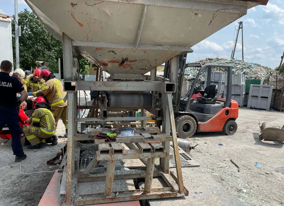 Kobieta była przytomna z ręką uwięzioną w maszynie. Strażacy musieli użyć sprzętu hydraulicznego oraz pił, żeby uwolnić rękę kobiety .