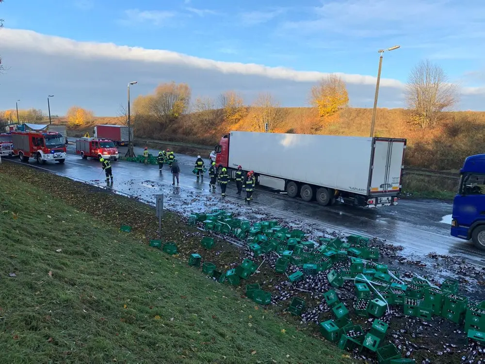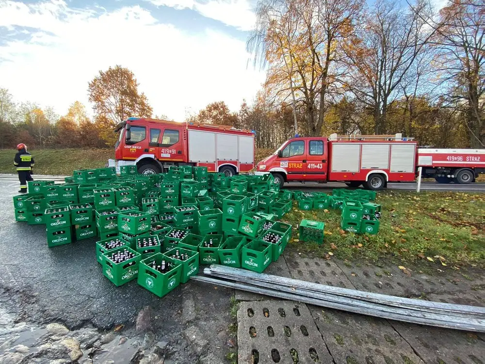 Około godz. 8:00 straż pożarna w Choszcznie została wezwana do ładunku, który wypadł z ciężarówki na drogę. To były setki butelek piwa.