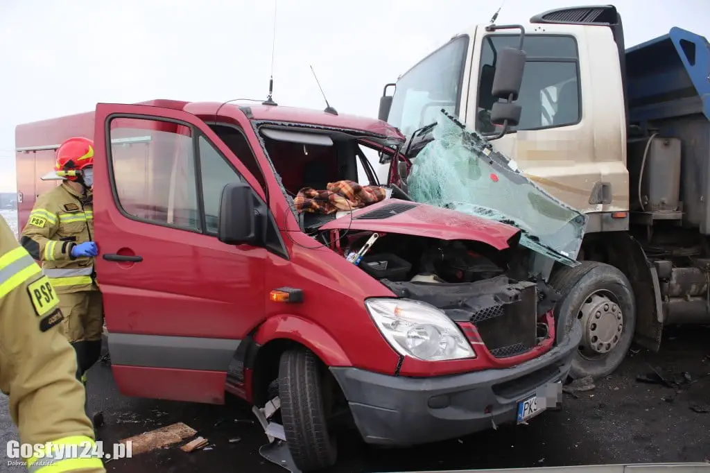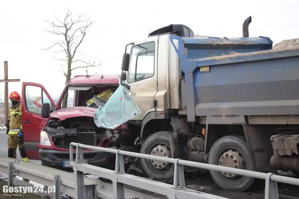 Do zdarzenia doszło kilka minut po godz. 12 (wczoraj, w piątek 8 stycznia) na łuku trasy Gostyń-Grabonóg. Samochód ciężarowy marki DAF przewożący piasek, który jechał w kierunku Grabonoga zderzył się z busem marki Mercedes. To auto poruszało się w stronę Gostynia.