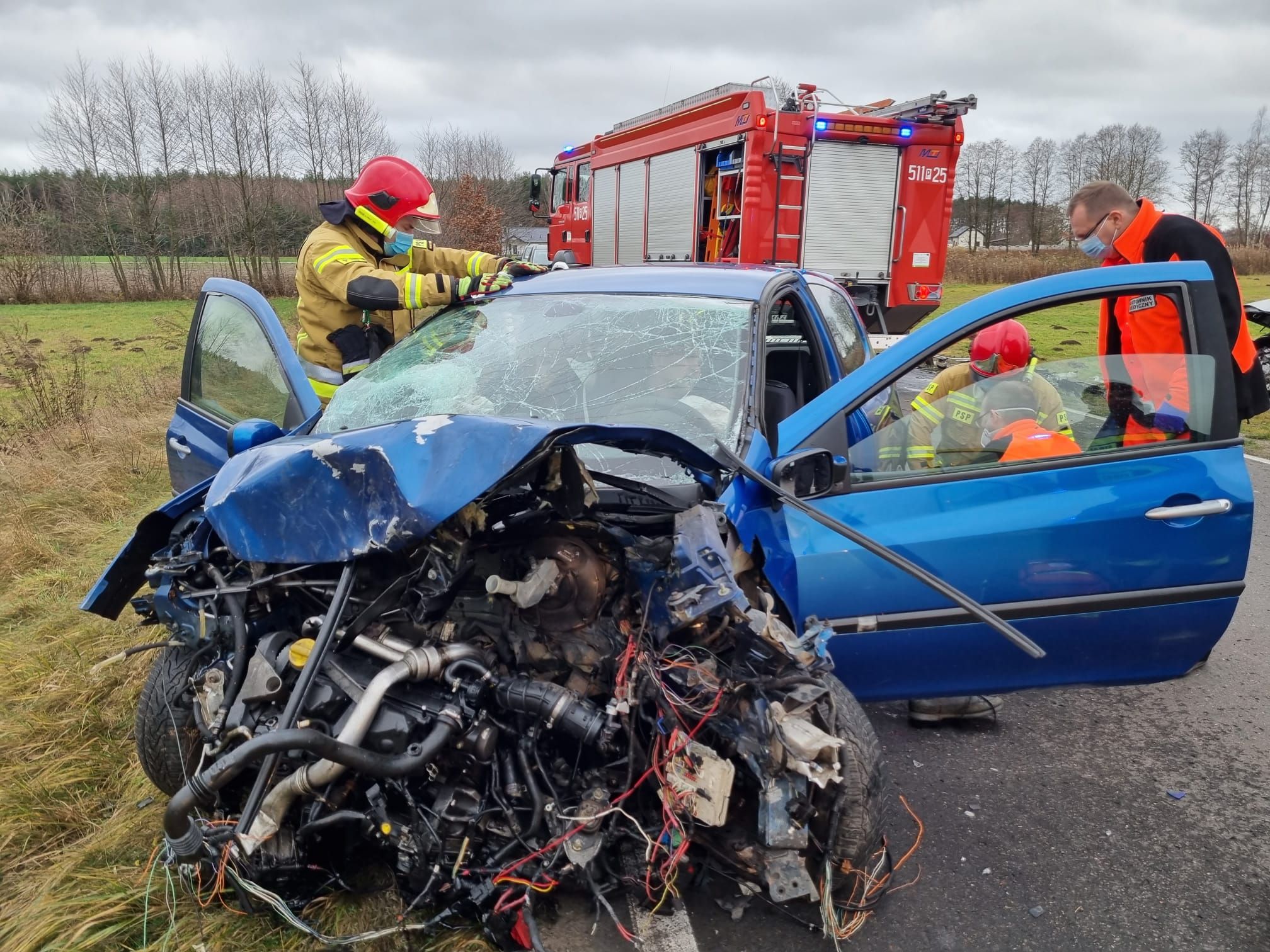 przyjeździe pierwszych zastępów na miejsce zdarzenia zastano dwa samochody osobowe po zderzeniu czołowym, dwie osoby wyszły z pojazdów natomiast cztery kolejne siedziały w środku, wszyscy byli przytomni. Samochodami podróżowało łącznie 6 osób (w tym jedno dziecko). Droga powiatowa była całkowicie zablokowana.