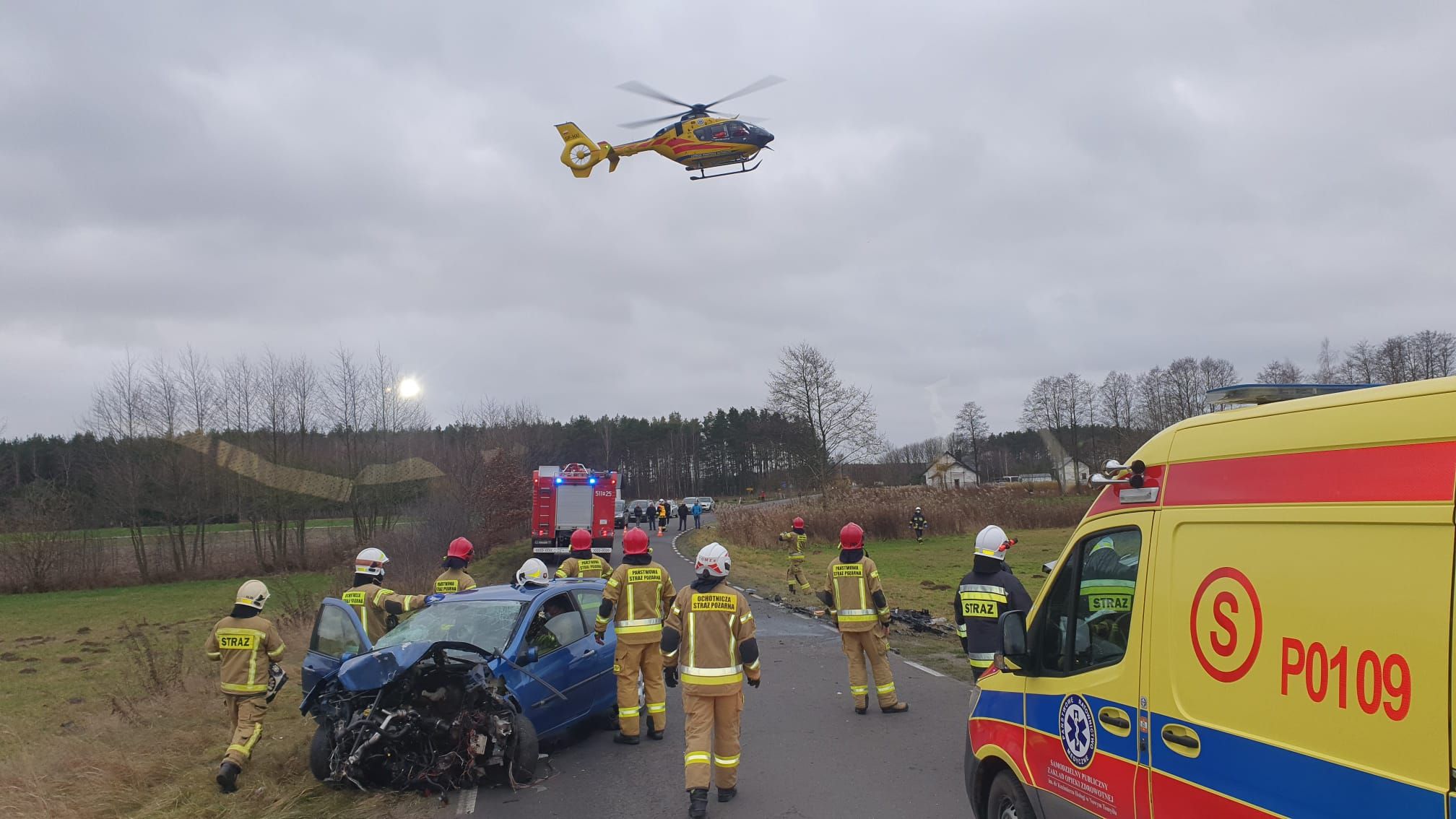 W dalszej kolejności działania polegały na wyznaczeniu lądowiska dla Lotniczego Pogotowia Ratunkowego, pomocy w transporcie osób poszkodowanych do śmigłowca i karetek, neutralizacji i sorpcji rozlanych płynów eksploatacyjnych oraz usunięciu zanieczyszczeń powypadkowych z drogi. Po przeprowadzonych badaniach lekarz zdecydował o transporcie do szpitala pięciu uczestników zdarzenia: cztery osoby do szpitala w Nowym Tomyślu oraz jedna śmigłowcem LPR do szpitala w Puszczykowie. Szósty uczestnik zdarzenia odmówił udzielenia pomocy medycznej.