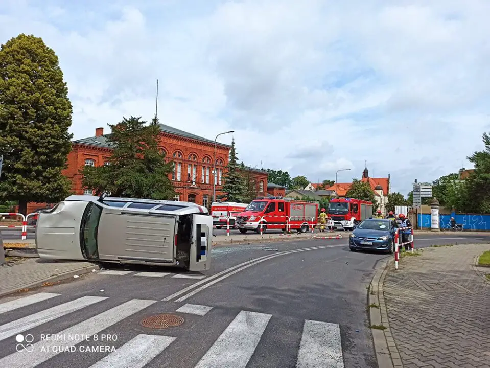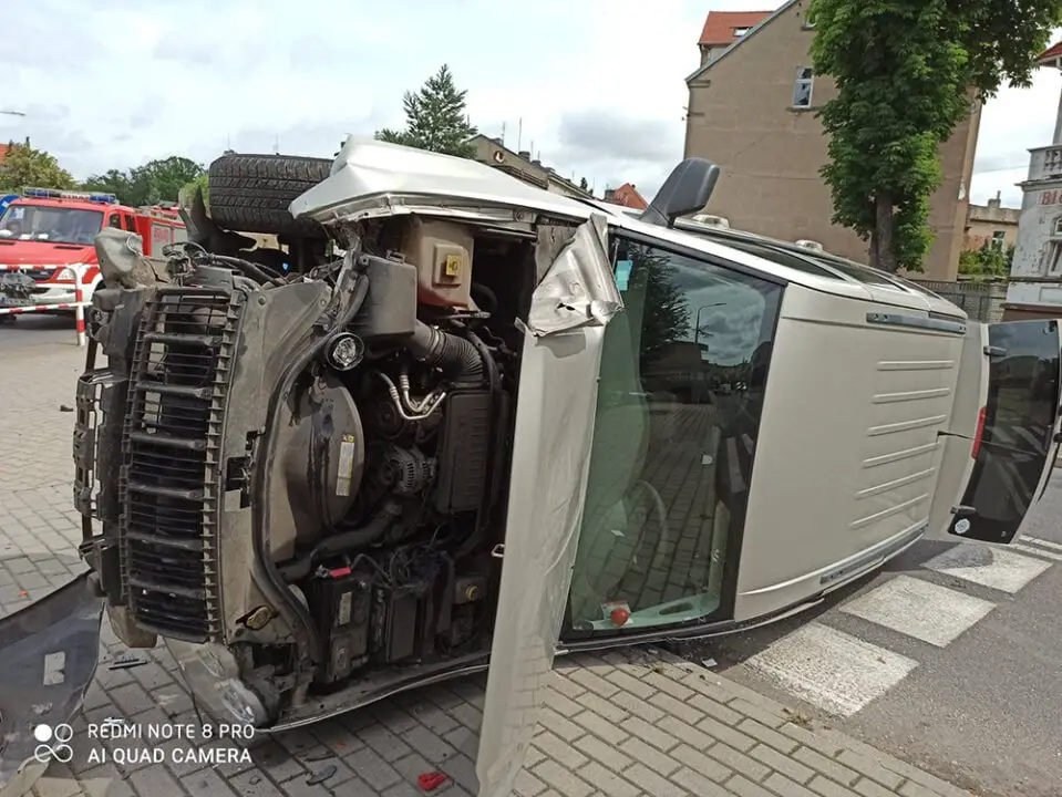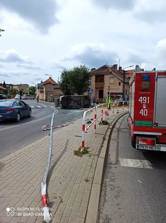Uszkodzony pojazd zatrzymał się w pozycji na lewym boku po drugiej stronie chodnika na ulicy przebiegającej równolegle do drogi krajowej. Kierowca uszkodzonego samochodu w momencie przybycia zastępów straży pożarnej znajdował się poza pojazdem.