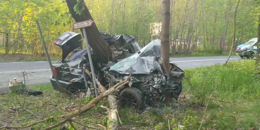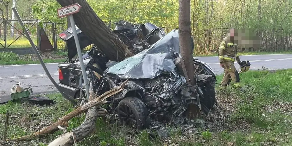 Kierujący bmw z pewnością pędził z dużą prędkością. Widać to po uszkodzeniach bmw, z którego nic nie zostało. To cud, że kierowca bmw wyszedł z auta przytomny po tak potężnym uderzeniu w drzewo.