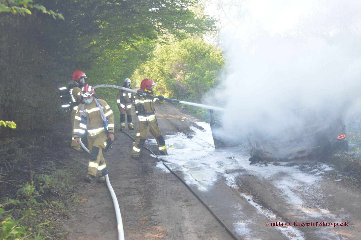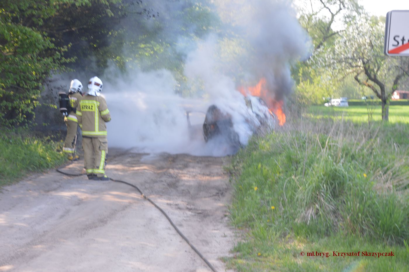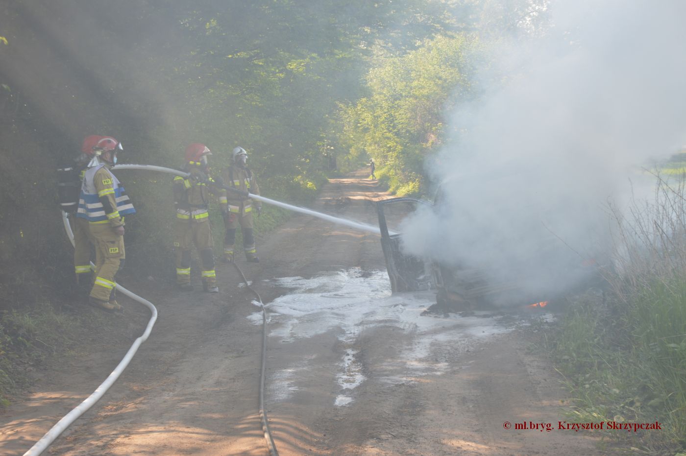 W rejon leśniczówki alarmowo udali się strażacy z rawickiej komendy oraz z Ochotniczej Straży Pożarnej w Izbicach. Gdy dotarli na miejsce, pożar obejmował już cały pojazd, a płomienie rozprzestrzeniały w kierunku trawy i drzew.