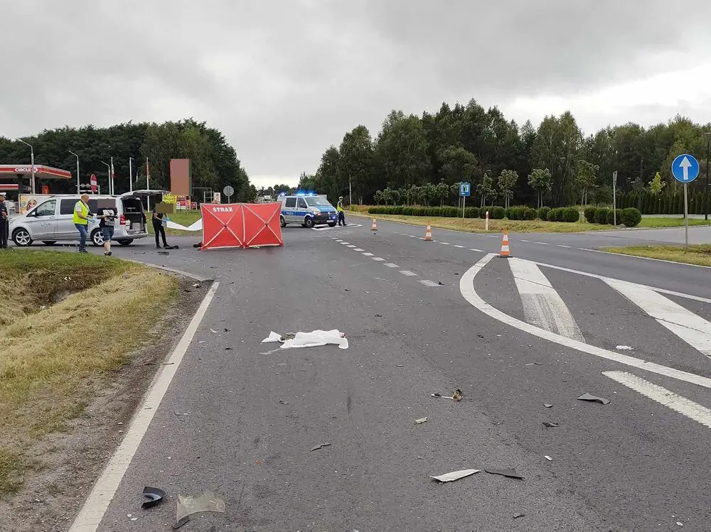 Ze wstępnych ustaleń pracujących na miejscu policjantów wynika, że kierujący motorowerem z pasażerem, wyjeżdżając ze stacji paliw na drogę nie ustąpił pierwszeństwa przejazdu kierującemu samochodem ciężarowym. Niestety w wyniku zdarzenia obaj mężczyźni jadący motorowerem ponieśli śmierć na miejscu. Ofiarami wypadku są dwaj mężczyźni w wieku 32 lat i 37 lat.