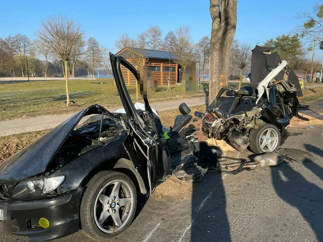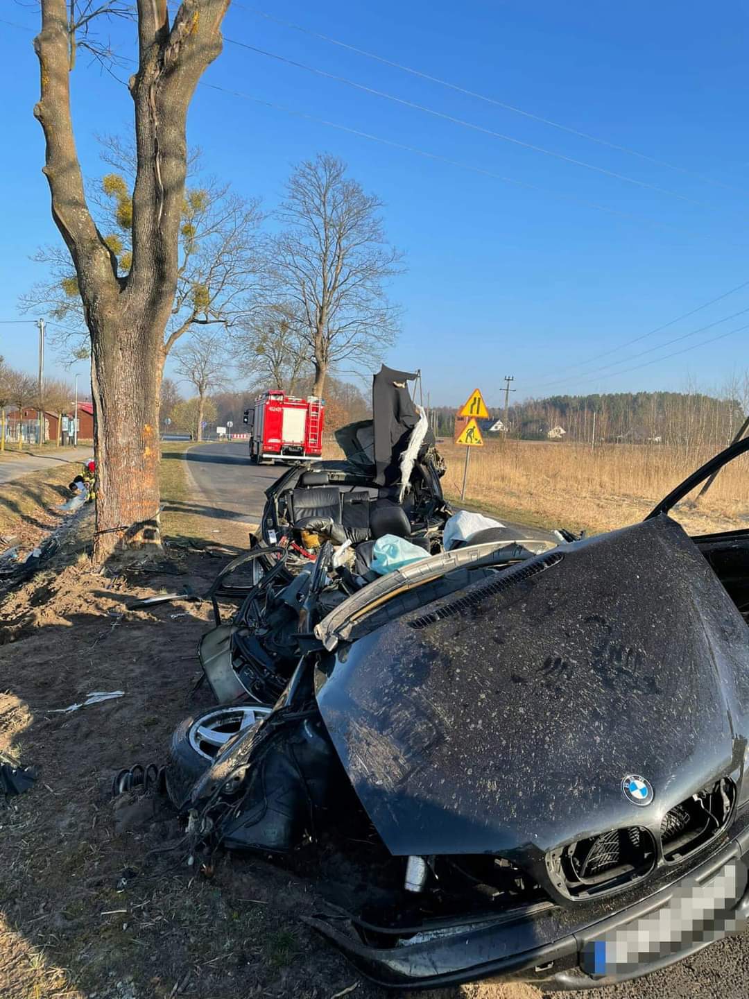 Ze wstępnych ustaleń będących na miejscu mundurowych wynika, że na łuku drogi auto marki BMW z czterema mężczyznami w środku zjechało na pobocze, a następnie uderzyło w drzewo.