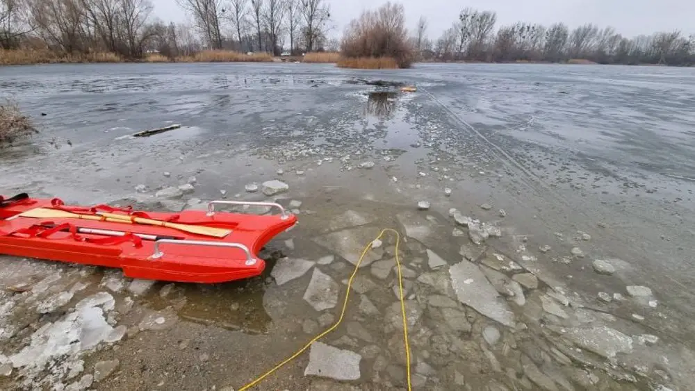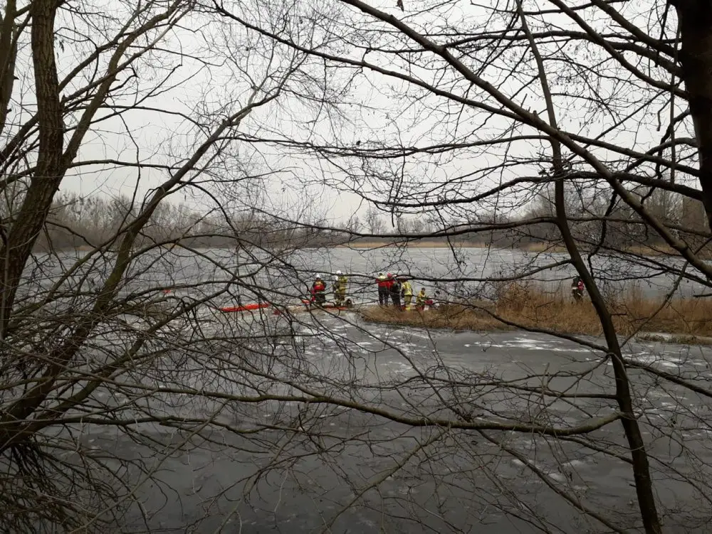 Strażacy zobaczyli skrajnie wychłodzonego mężczyznę, który resztkami sił utrzymywał się na tafli lodu około 20 metrów od brzegu.