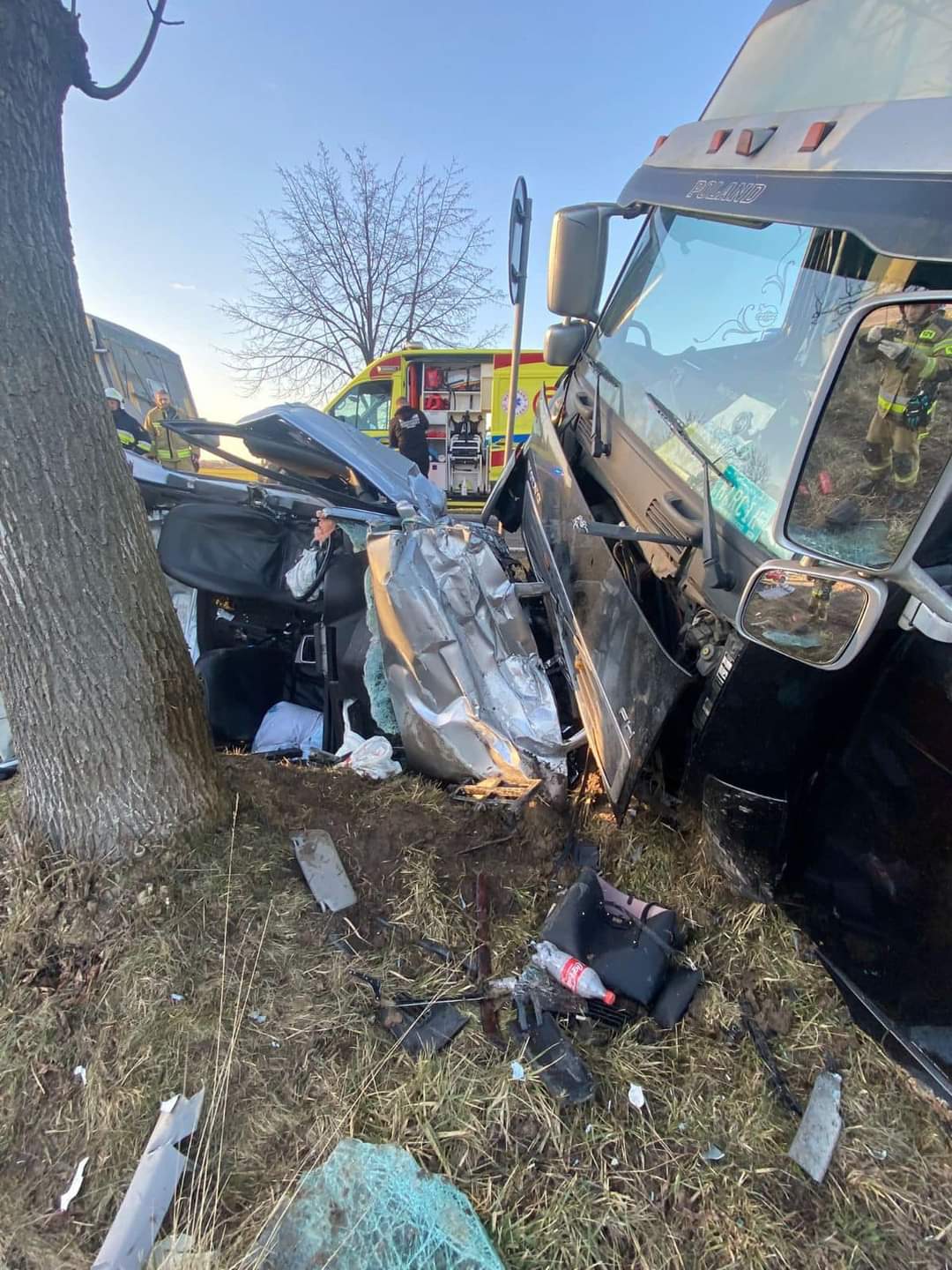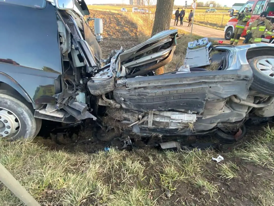 Na skutek zderzenie obydwa pojazdy wypadły z drogi do rowu. Samochód osobowy został bardzo mocno rozbity. Niestety jednej z osób poszkodowanych nie udało się uratować. Na skutek odniesionych obrażeń poniosła śmierć na miejscu. Druga ranna osoba trafiła do szpitala.