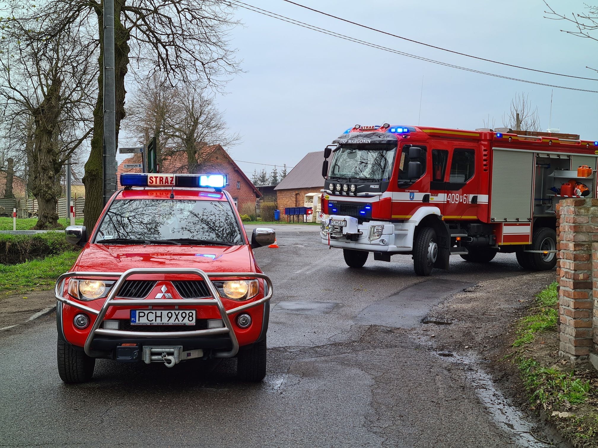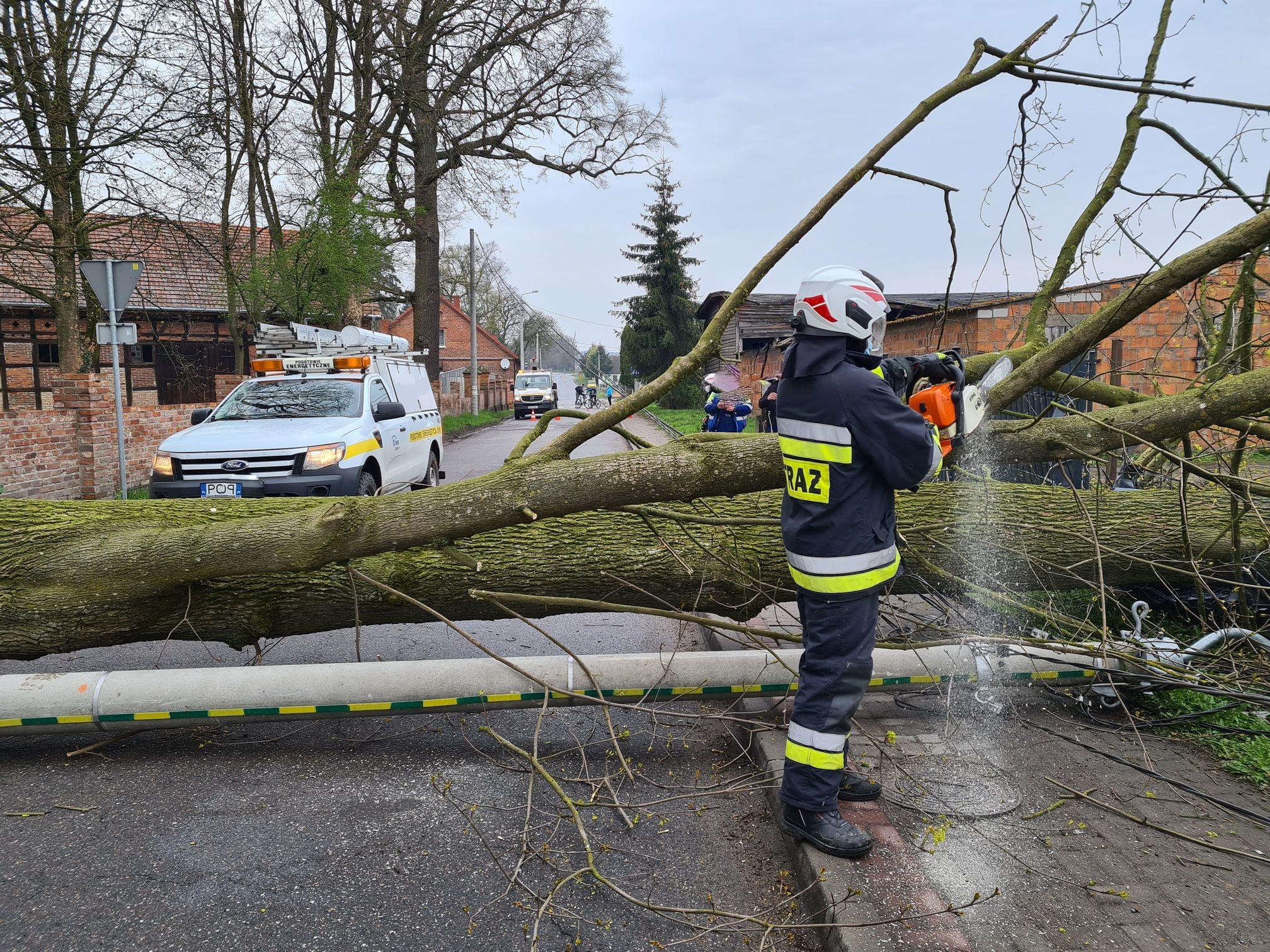 Na miejsce zdarzenia zadysponowano druhów z OSP Margonin, strażaków z JRG w Chodzieży oraz pogotowie energetyczne. Po przybyciu pierwszych zastępów stwierdzono, że na drodze leży drzewo, a korona znajdowała się częściowo na płocie oraz dachu budynku. Dodatkowo przewrócony był również słup energetyczny z, którego iskrzyły przewody elektryczne.