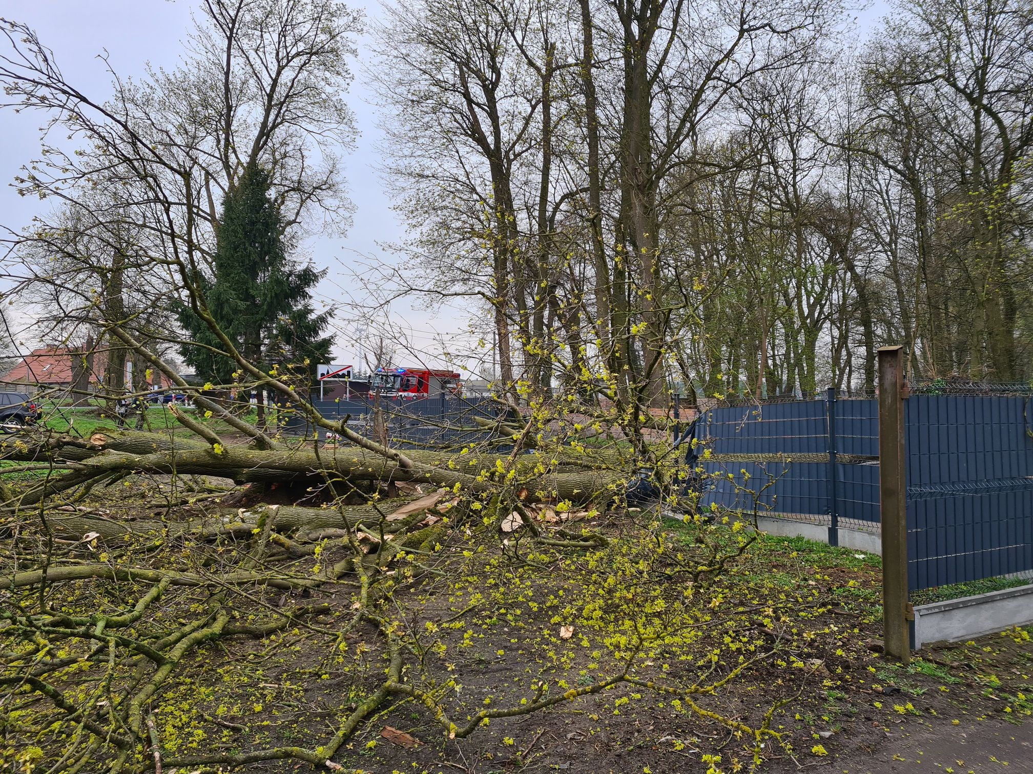 Do działań strażaków należało zabezpieczenie miejsca zdarzenia oraz niedopuszczenie osób postronnych na teren działań. Przybyłe na miejsce pogotowie energetyczne odłączyło prąd w linii wysokiego napięcia, co pozwoliło strażakom przy pomocy pił mechanicznych do drewna usunąć zagrażające kawałki drzewa. Kilka metrów kwadratowych dachu uległo uszkodzeniu, a ubytki w dachu zabezpieczono plandeką dachową.