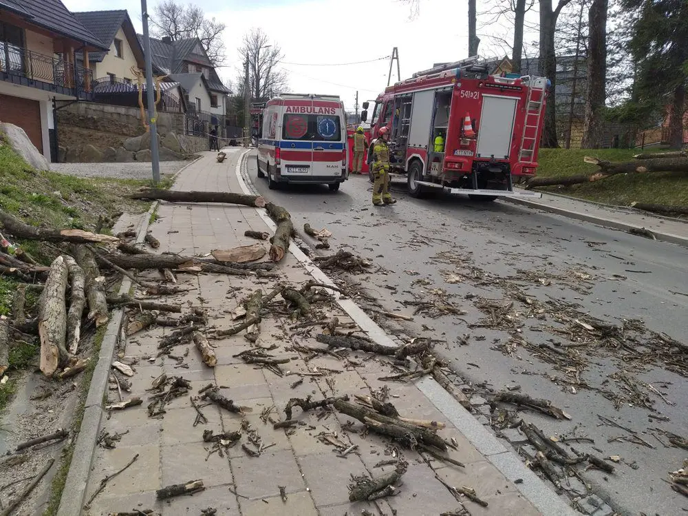 Wszystko wydarzyło się w poniedziałek na ul. Stachonie w Zakopanem. Silny wiatr złamał drzewo. Złamane drzewo upadło na jadący samochód. Na miejsce zostały wysłane służby ratunkowe.