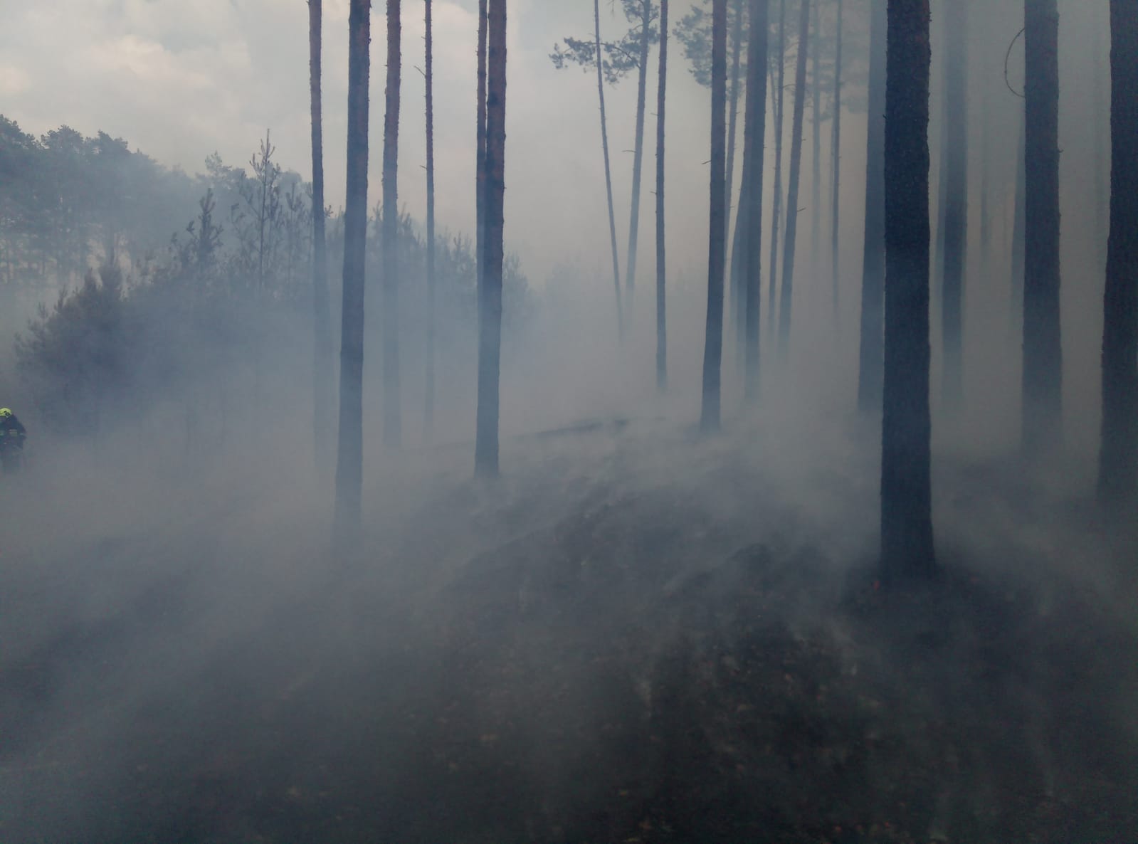 Po przybyciu na miejsce pierwszych zastępów Straży Pożarnej zastano pożar w obszarze zrębu. Porywisty wiatr szybko rozprzestrzeniał ogień w kierunku młodnika oraz w głąb lasu. Ognie lotne wędrowały ponad głowami strażaków przełamując kolejne linie obrony.