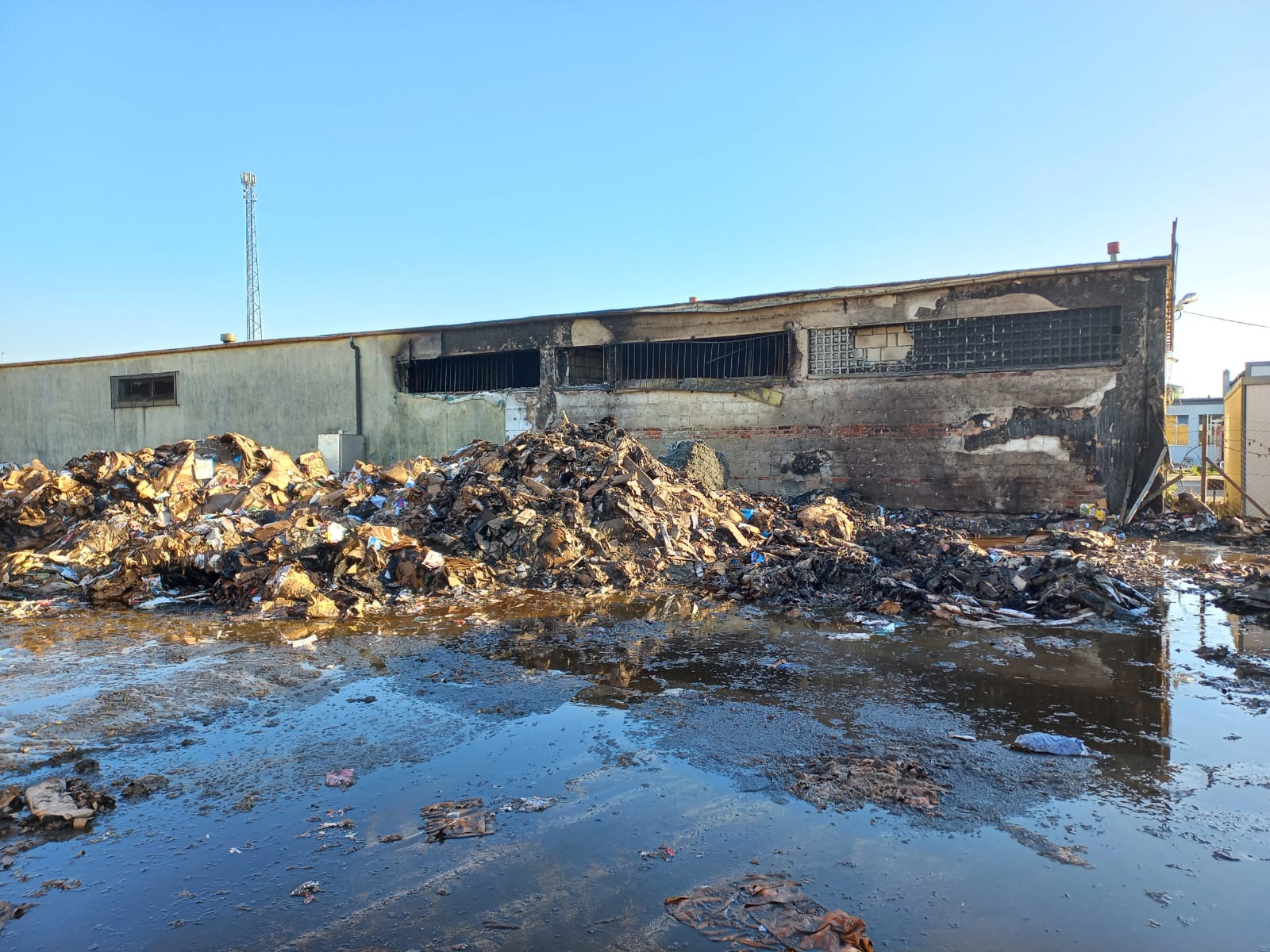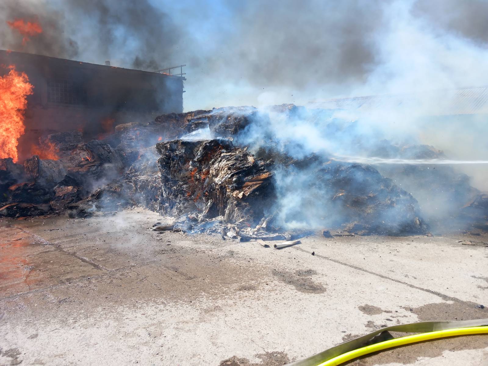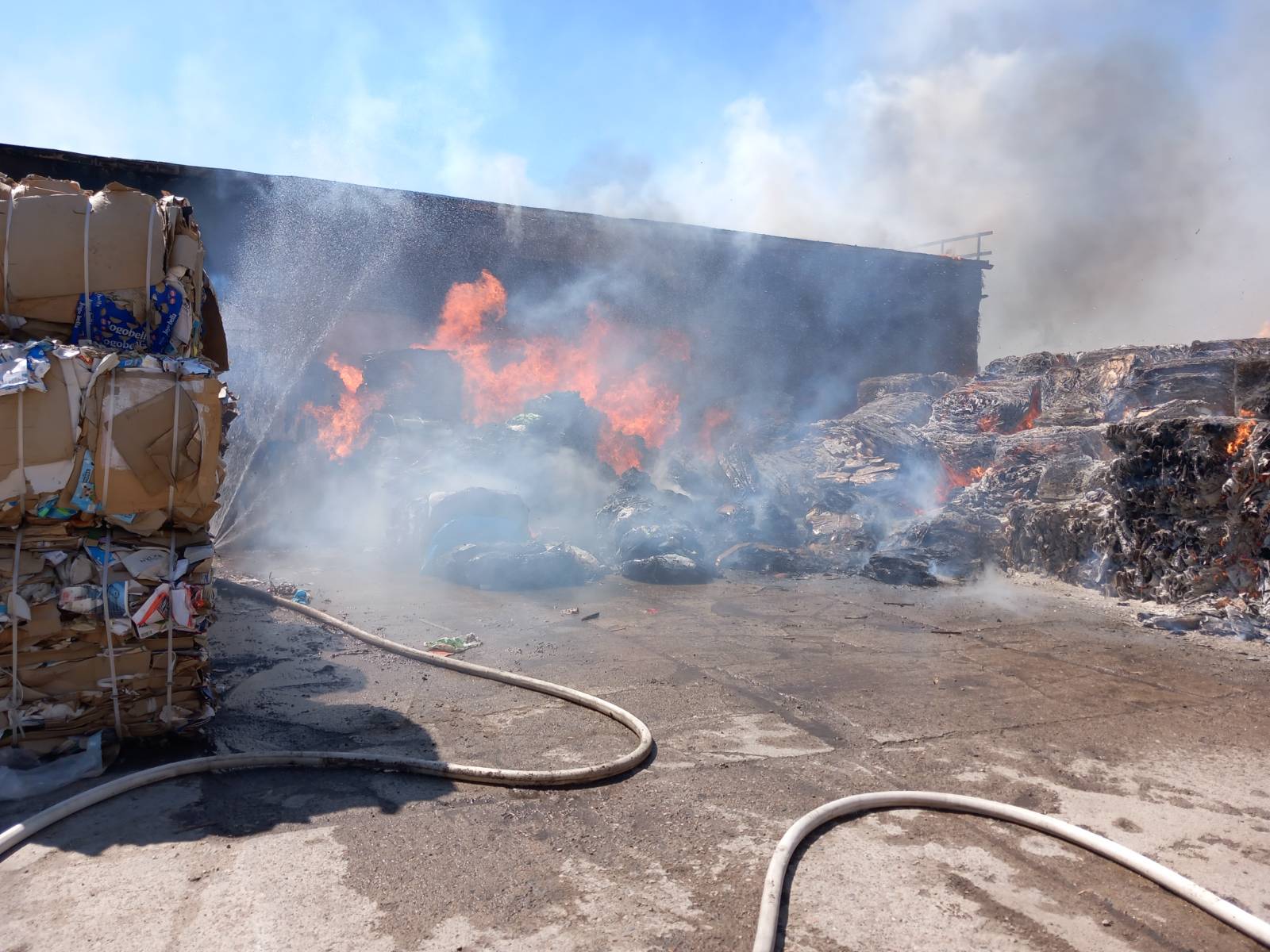 Po przybyciu na miejsce zdarzenia zastępy zastały palącą się hałdę sprasowanej w baloty makulatury i tworzywa sztucznego. Pożarem objęte było również wnętrze garażu blaszanego, pożar rozprzestrzeniał się na budynek magazynowy, w którym składowane były artykuły gospodarstwa domowego.