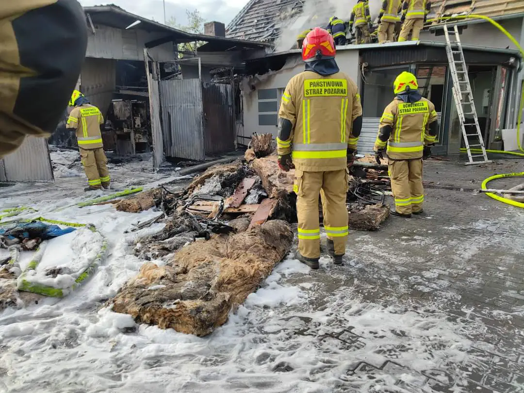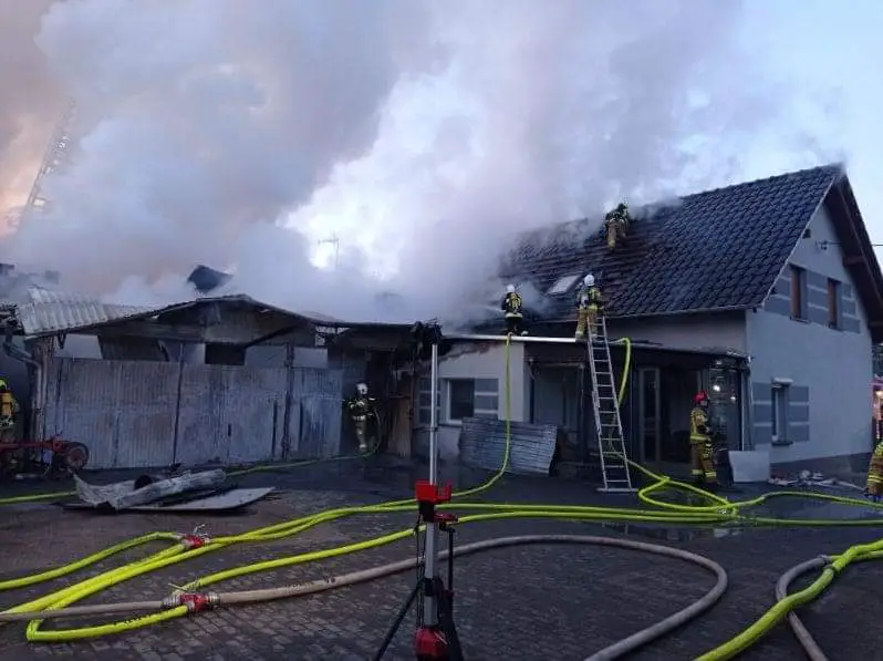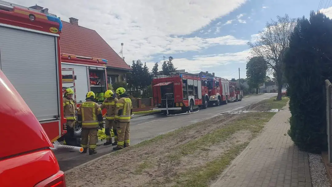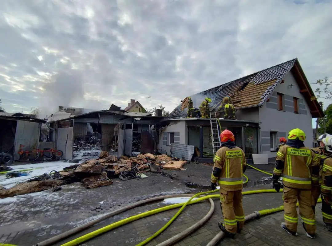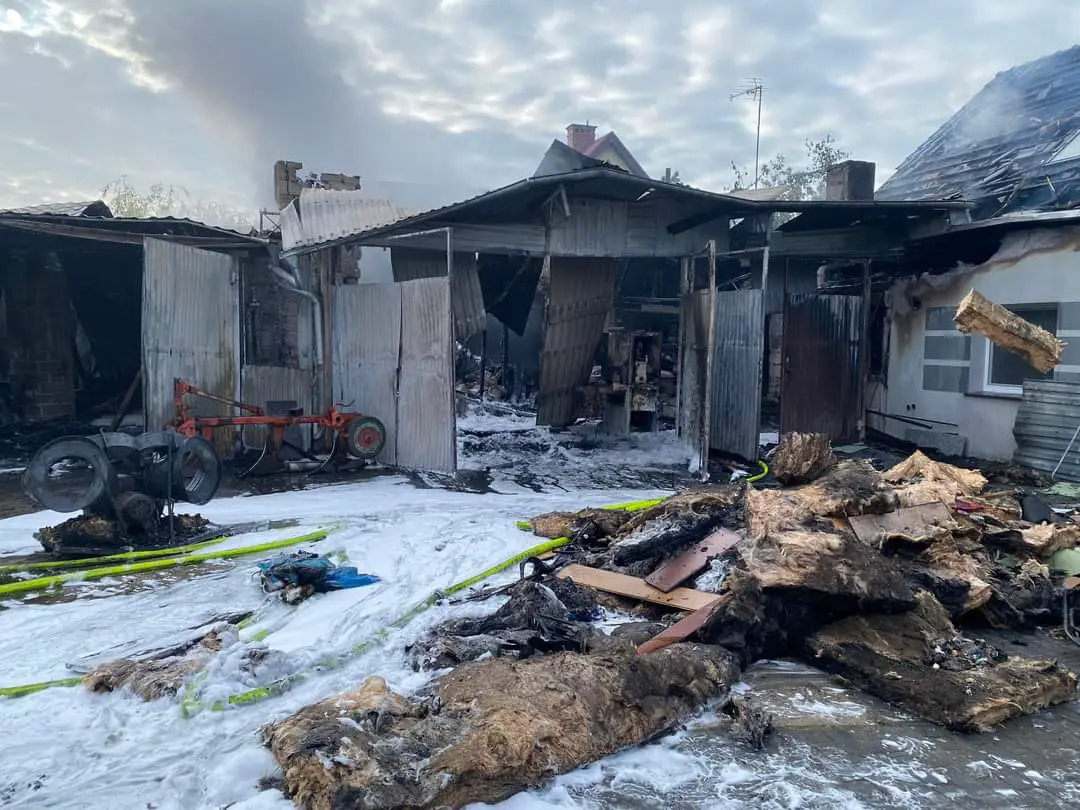 Ogień przedostał się również na budynek mieszkalny. Spalony i uszkodzony został dach w całości od strony podwórza oraz od strony drogi. Uszkodzona i spalona elewacja od strony podwórza, okopcone meble w budynku, okopcone ściany, nasączone wodą ściany, strop oraz wyposażenie domu jednorodzinnego.