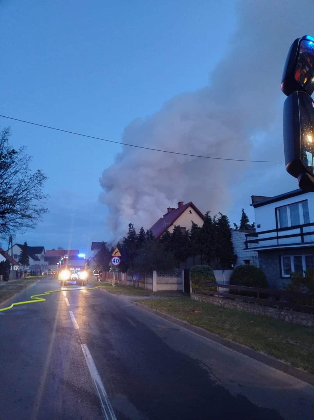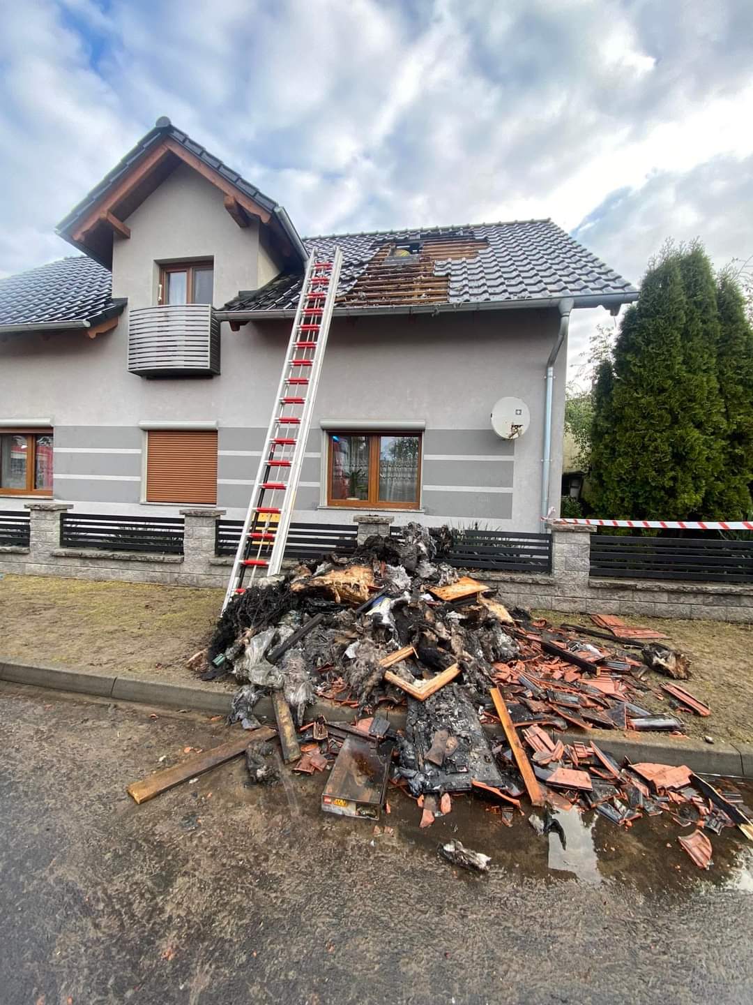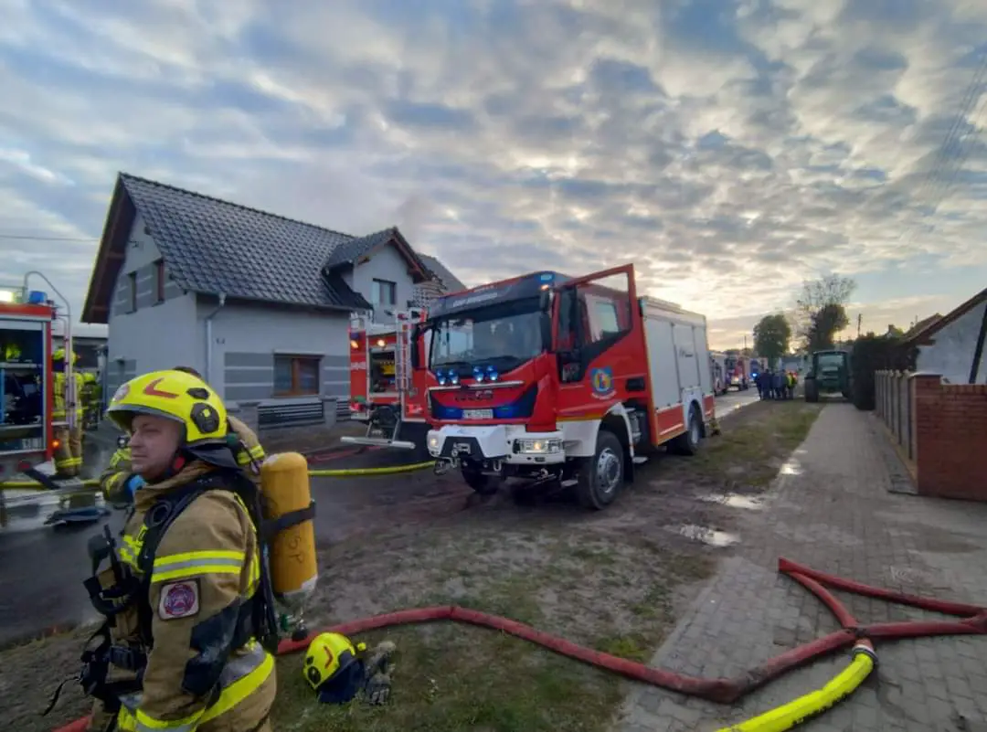 Ogień przedostał się również na budynek mieszkalny. Spalony i uszkodzony został dach w całości od strony podwórza oraz od strony drogi. Uszkodzona i spalona elewacja od strony podwórza, okopcone meble w budynku, okopcone ściany, nasączone wodą ściany, strop oraz wyposażenie domu jednorodzinnego.