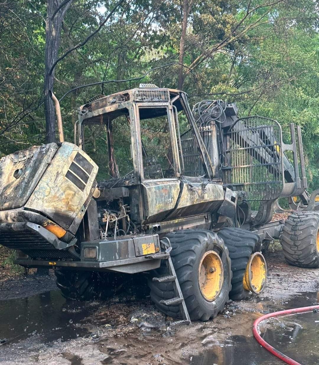 Po dojeździe zastano pożar maszyny do drzewa marki Forwarder oraz lasu. Strażacy natychmiast przystąpili do akcji gaśniczej, za pomocą dwóch prądów wody.