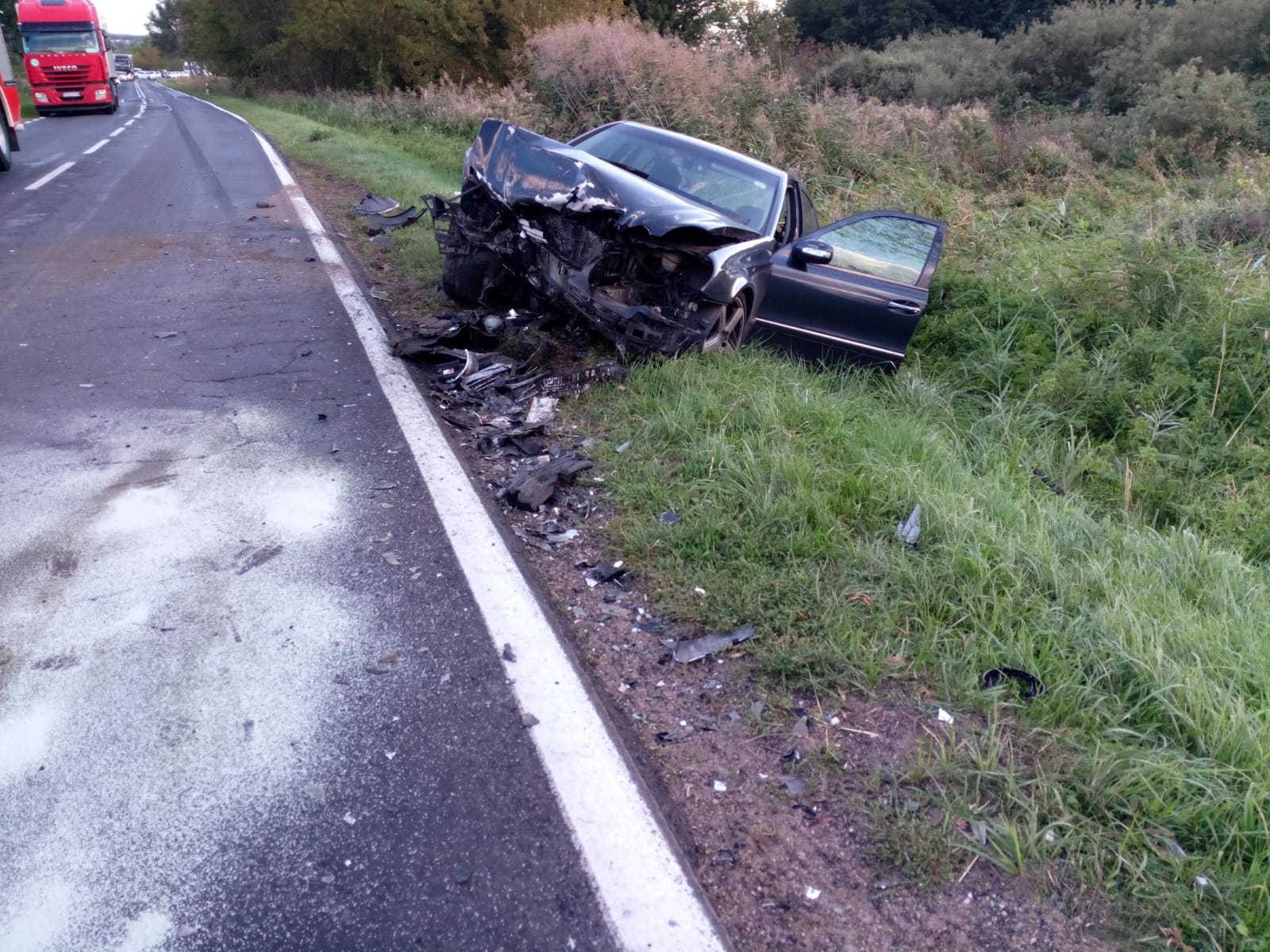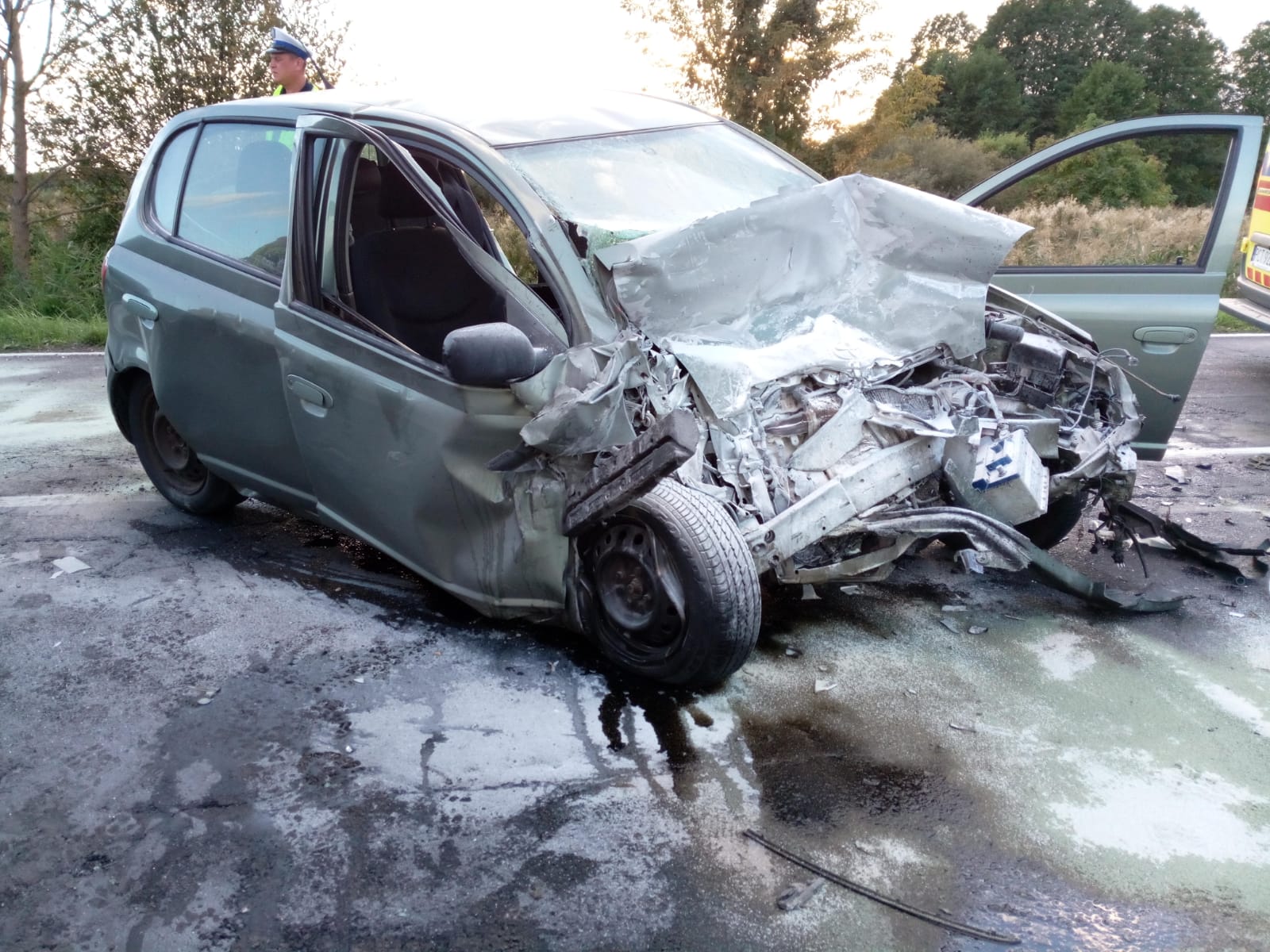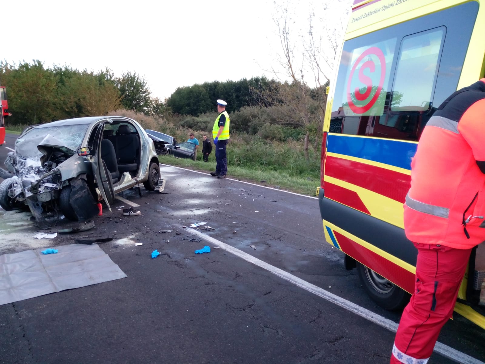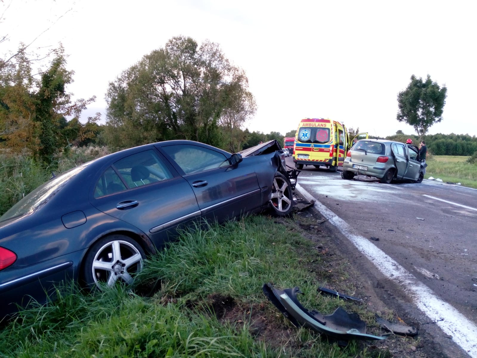 Po dojeździe na miejsce zdarzenia zastano jeden pojazd znajdujący się w rowie, a drugi na środku jezdni blokując drogę wojewódzką w obu kierunkach.