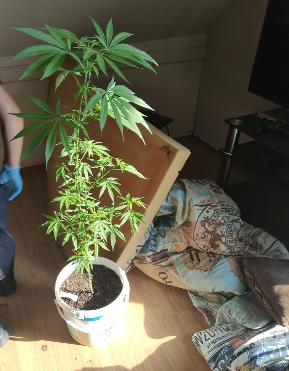 Następnie w miejscu swojego zamieszkania zatrzymany został drugi 21-letni sprawca. Na jego biurku mundurowi zauważyli dwie okopcone lufki i zaczęli podejrzewać, że chuligańskie zachowania to nie jedyne przewinienie mężczyzny. Postanowili dokładnie sprawdzić mieszkanie i jak się później okazało przypuszczenia te były trafne. Zatrzymany na parapecie wyhodował roślinę konopi, ponadto w szafie ukrywał susz roślinny. Późniejsze badania potwierdziły, że była to marihuana. 21-latek przyznał się do podpalenia śmietnika przy pobliskim cmentarzu i uszkodzenia drzwi wejściowych do szkoły.