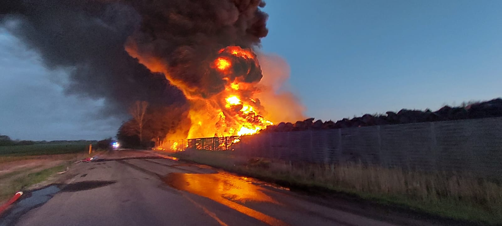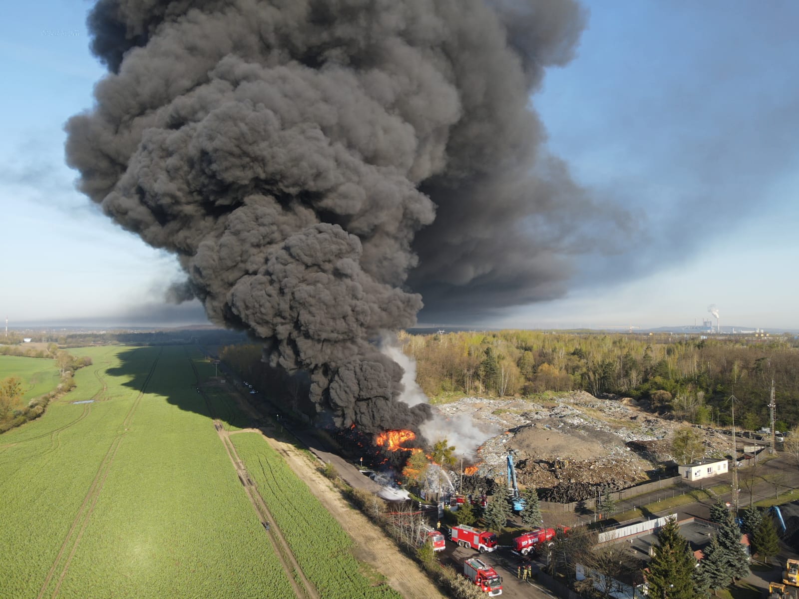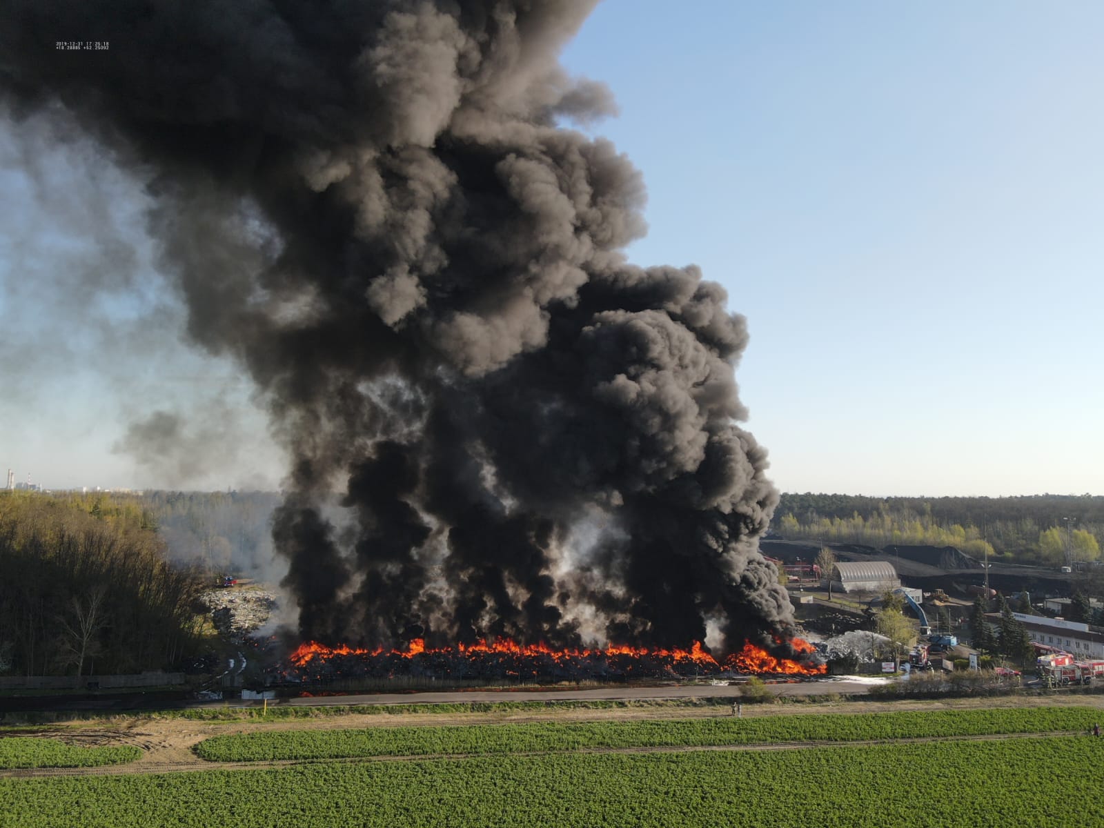 Po przybyciu na miejsce zdarzenia stwierdzono pożar opon oraz tworzyw sztucznych zgromadzonych w pryzmach na składowisku odpadów. Panowało bardzo duże zadymienie oraz wysoka temperatura. Kłęby dymu były widoczne z kilkunastu kilometrów.