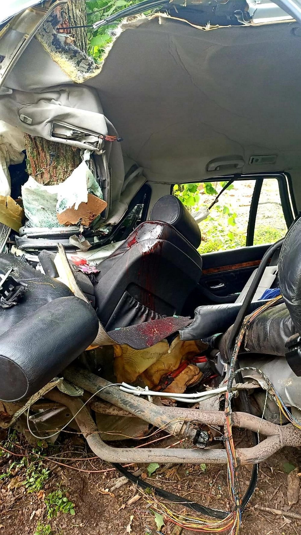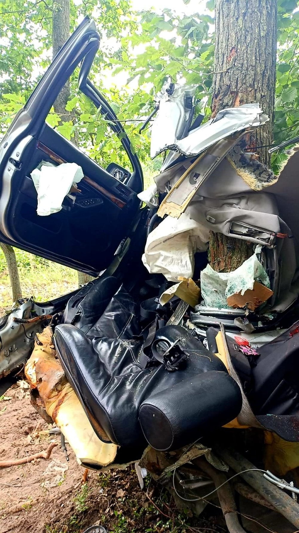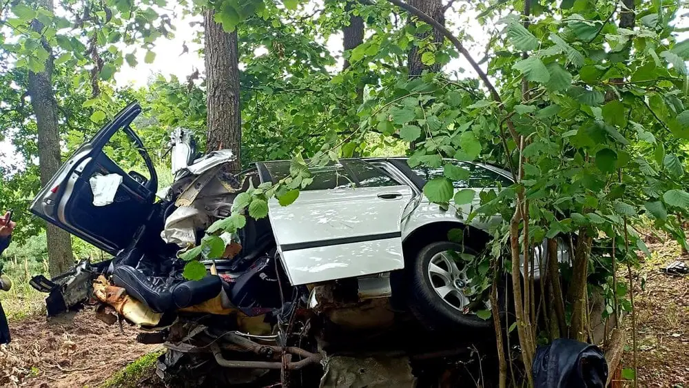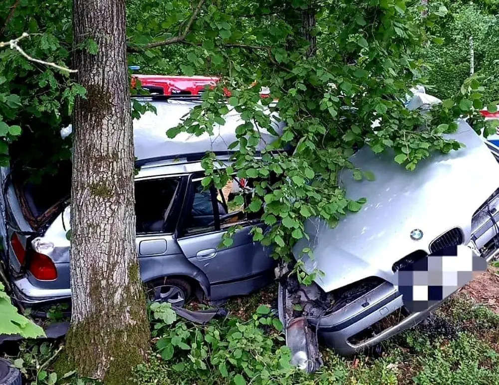 Bmw wypadło z drogi i z potężną siłą uderzyło w drzewo. Uderzenie było tak wielkie, że bmw odwinęło się na drzewie.