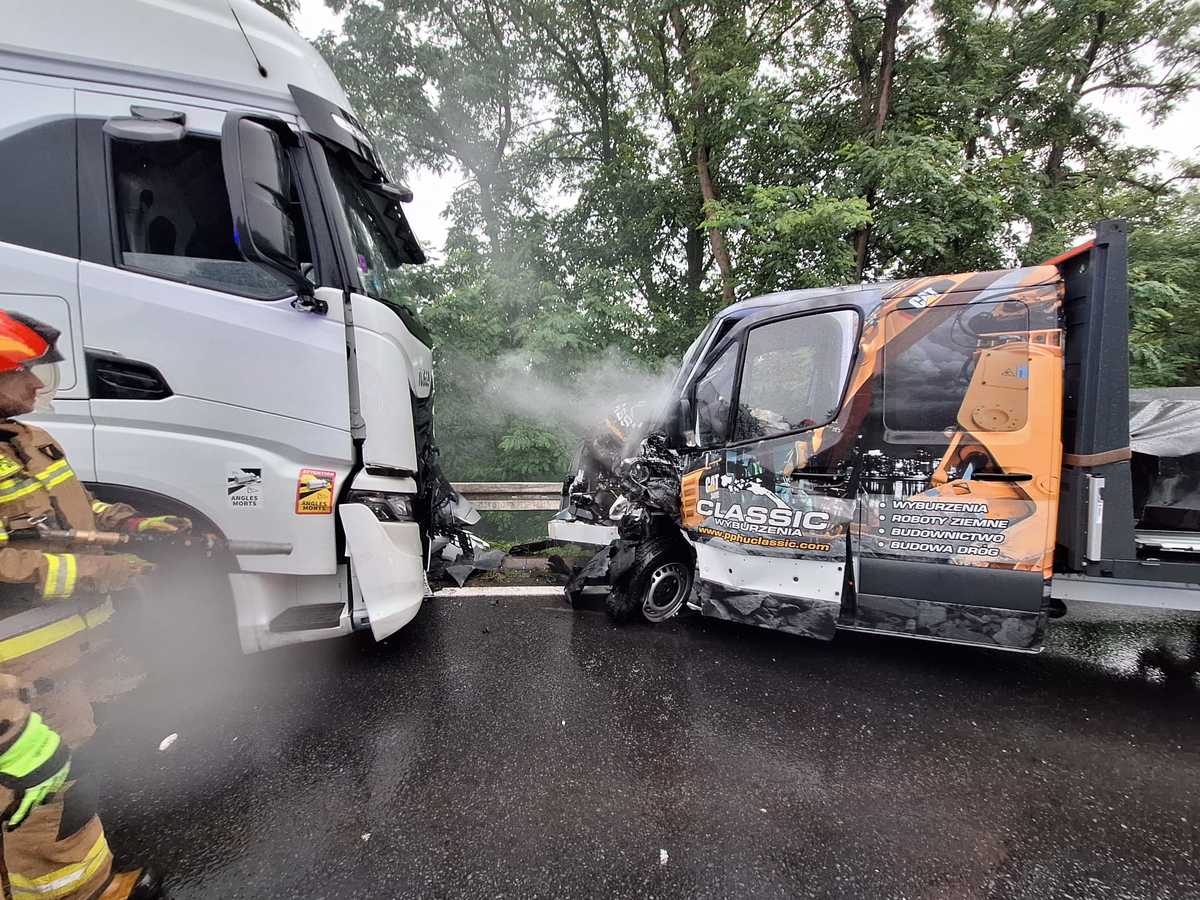 W piątek 2 sierpnia o godzinie 17:08 na drodze krajowej nr 12 we Wschowie na ul. Kazimierza Wielkiego na wiadukcie doszło do groźnie wyglądającego zdarzenia drogowego. Na łuku jezdni czołowo zderzył się samochód ciężarowy z busem.