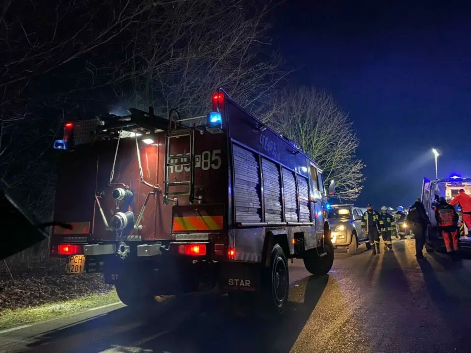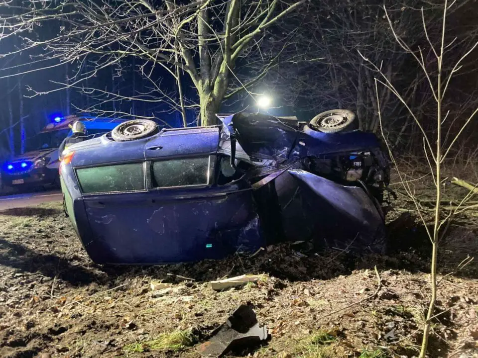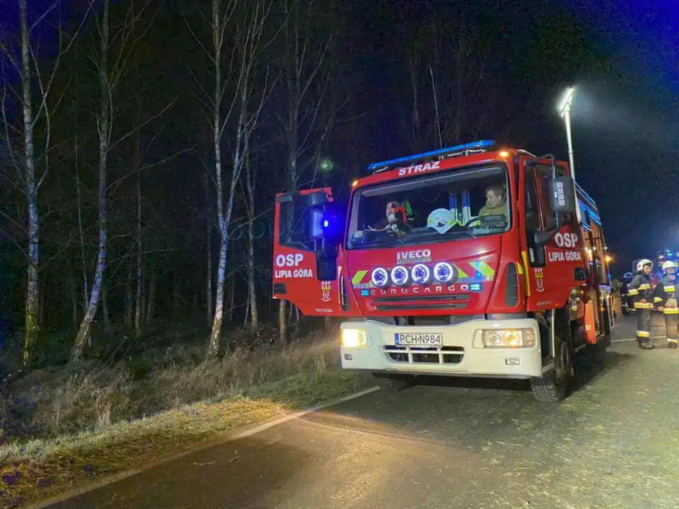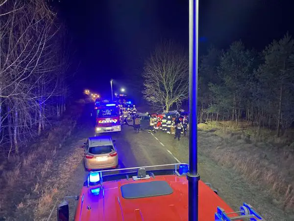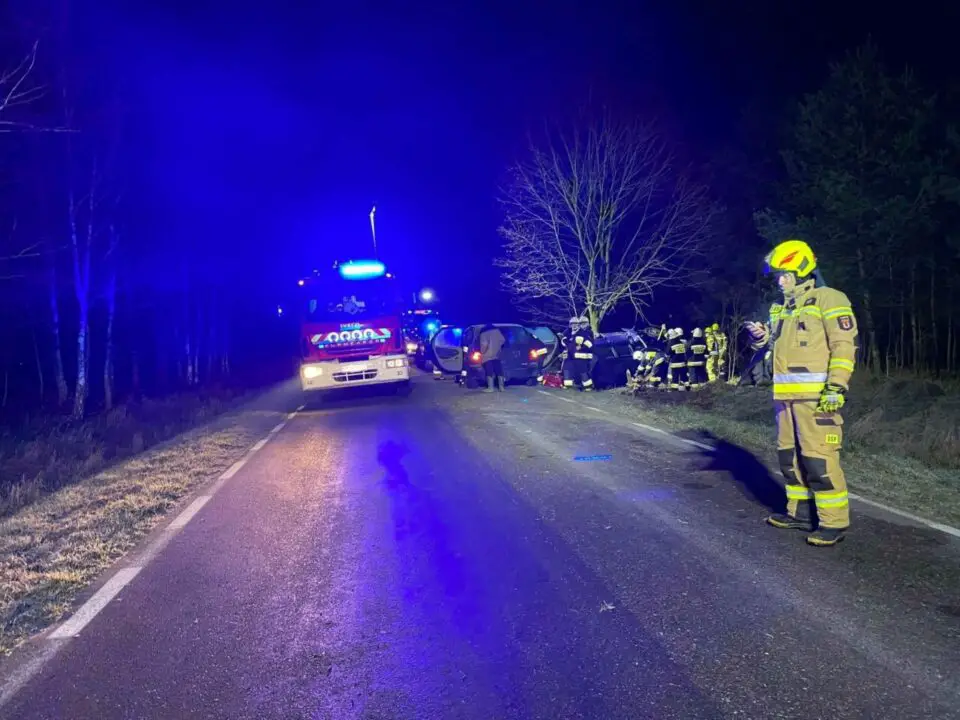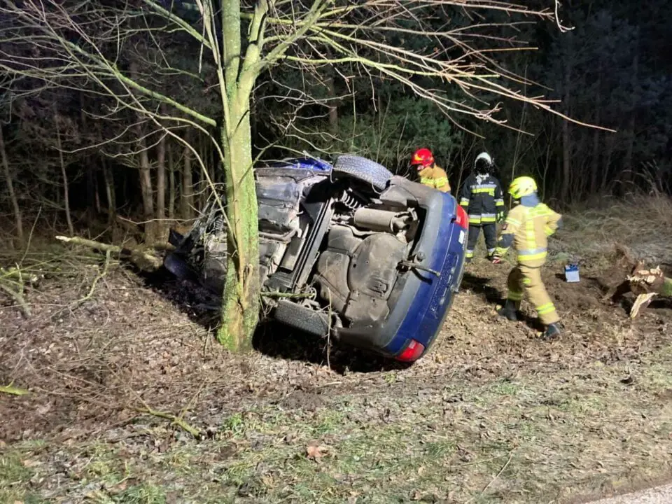 Po przybyciu straży na miejsce potwierdzono treść zgłoszenia. Auto osobowe dachowało po czym uderzyło w drzewo i zatrzymało się na prawym boku. Osoby poszkodowane znajdowały się na zewnątrz pojazdu i były pod opieką świadków zdarzenia. Działania strażaków polegały na zabezpieczeniu i oświetleniu miejsca zdarzenia, udzieleniu KPP osobom poszkodowanym oraz odłączeniu akumulatora. Poszkodowani trafili do Szpitala Specjalistycznego w Pile i Szpitala Powiatowego im. prof. Romana Drewsa w Chodzieży.