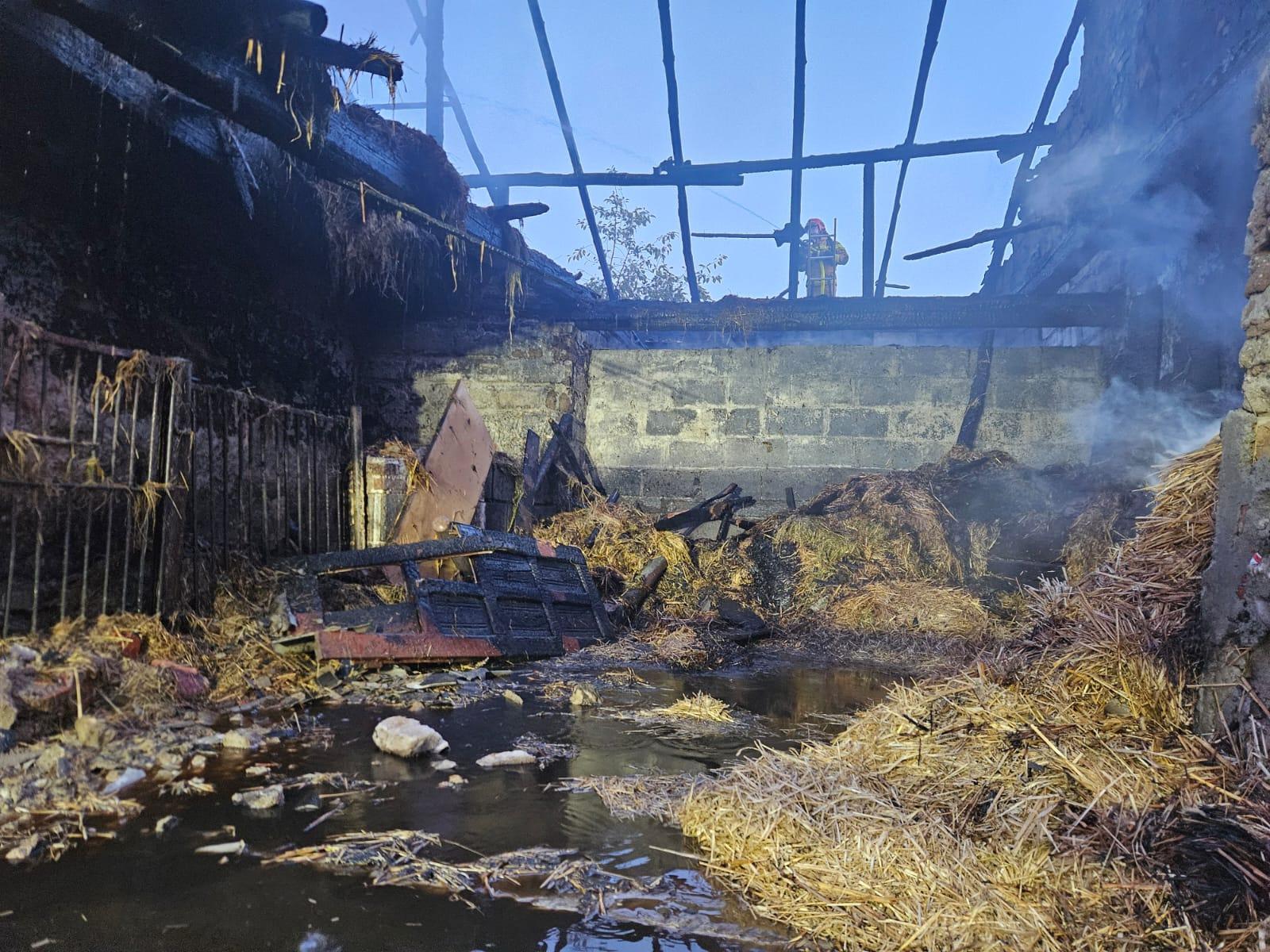 We wnętrzu składowane były również baloty słomy, które objęte zostały pożarem. Działania zastępów straży pożarnej polegały na zabezpieczeniu miejsca zdarzenia, budowie linii gaśniczych i podaniu prądów gaśniczych na palący się budynek oraz ewakuacji zwierząt pozostałych w obiekcie. Większość z palących się balotów słomy została wyciągnięta przez udostępnioną przez właściciela budynku ładowarkę, a następnie dogaszona. Kolejnym elementem działań strażaków były prace rozbiórkowe konstrukcji dachowej. Niestety pomimo dużego wysiłku strażaków związanych z ewakuacją nie wszystkie zwierzęta udało się uratować. Po zakończonych działaniach pogorzelisko sprawdzono za pomocą kamery termowizyjnej.