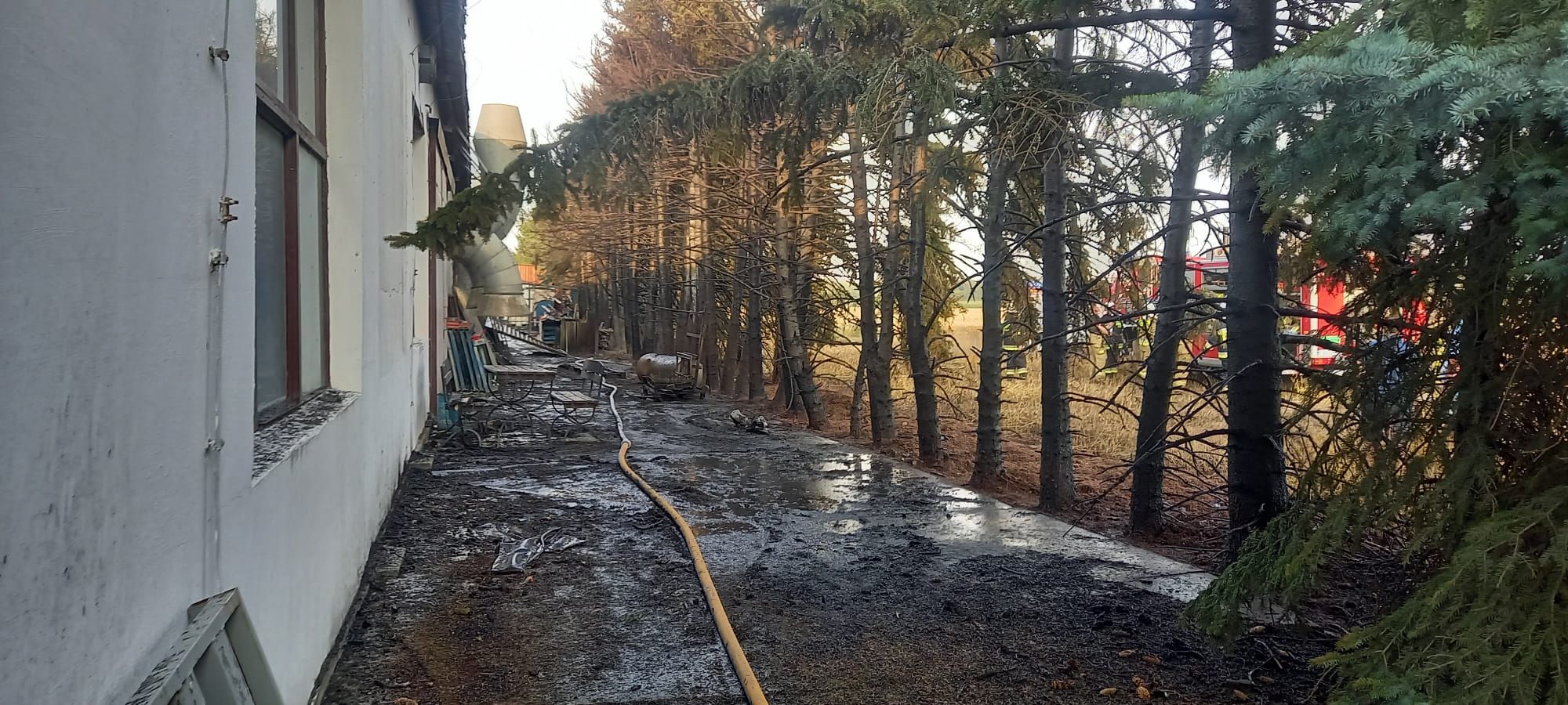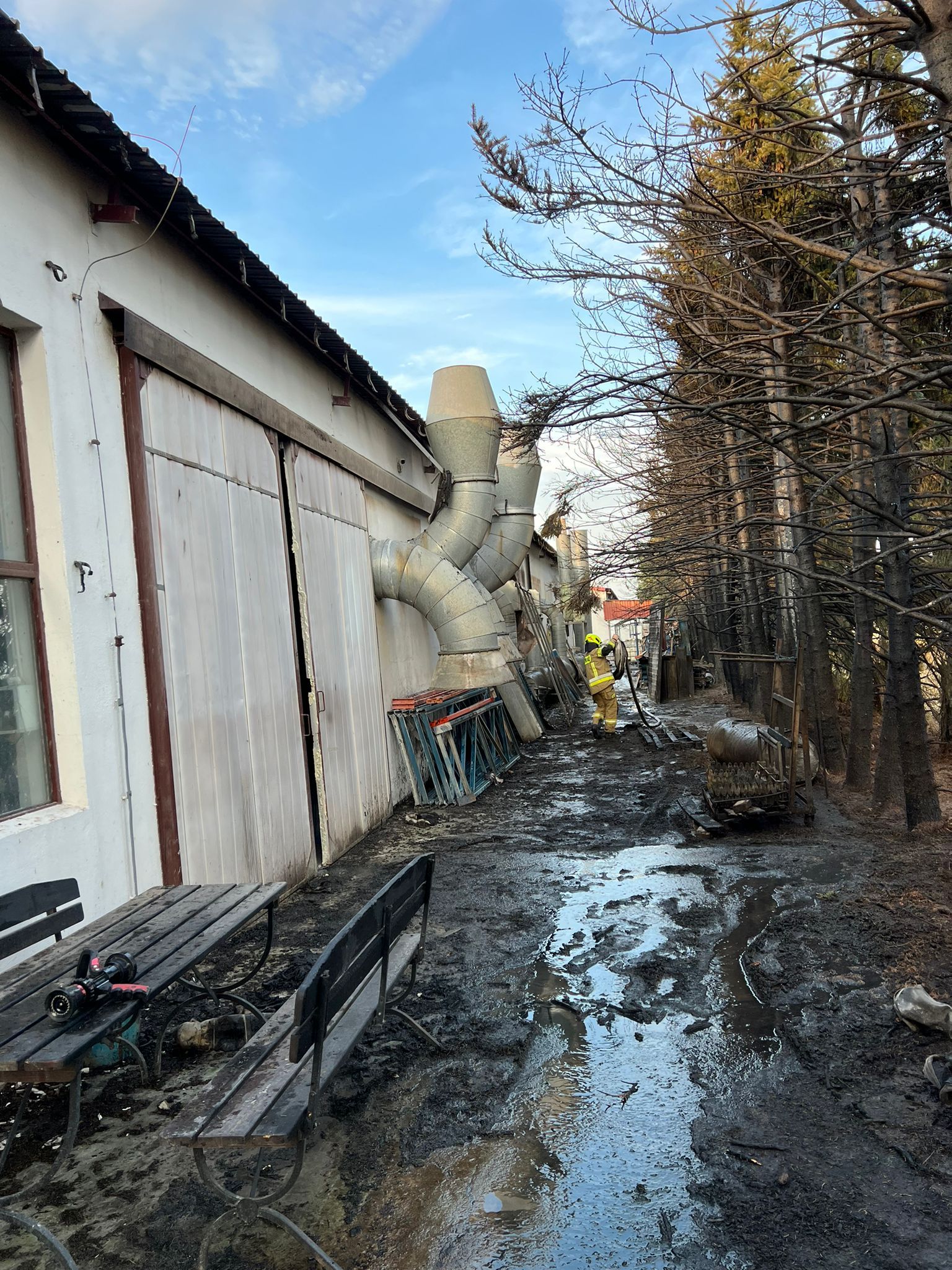 Działania strażaków polegały w pierwszej kolejności na zabezpieczeniu miejsca zdarzenia oraz podaniu prądów wody w obronie zagrożonej hali produkcyjnej zakładu stolarskiego oraz do podawania środków gaśniczych w natarciu na palące się zboże na pniu i na palące się drzewa iglaste. Końcowa faza działań skupiała się na kilkukrotnym sprawdzeniu wszystkich pomieszczeń zakładu stolarskiego oraz dachów budynków przy pomocy kamery termowizyjnej, która nie wykazała zagrożenia.