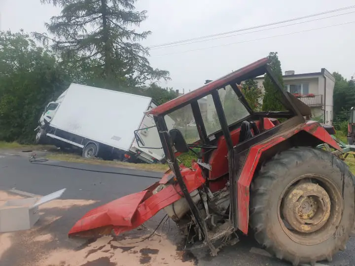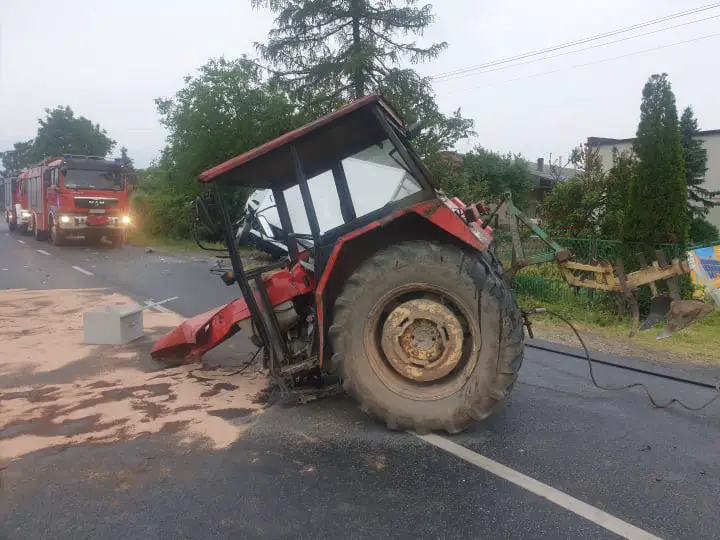 Po dojeździe na miejsce zdarzenia KDR stwierdził, że na drodze powiatowej numer 2019 doszło do zderzenia ciągnika rolniczego Ursus oraz samochodu dostawczego Mitsubishi Fuso. 2 osoby podróżujące ciągnikiem oraz kierowca ciężarówki opuściły pojazdy o własnych siłach przed przybyciem JOP. Kierowca samochodu dostawczego wymagał udzielenia pomocy medycznej. Droga powiatowa 2019 była zablokowana w obu kierunkach. Na miejscu obecny był Zespół Ratownictwa Medycznego oraz Policja.