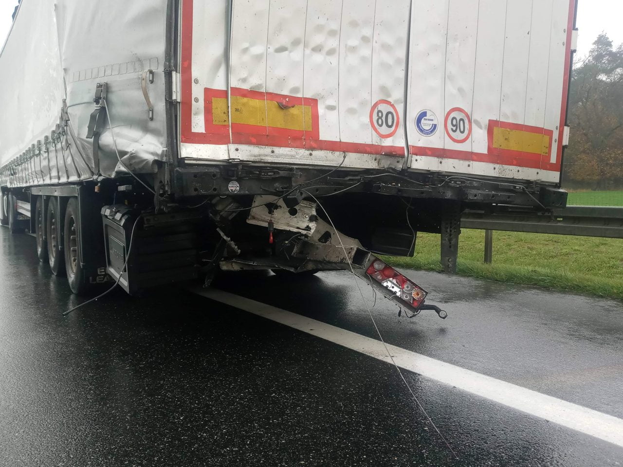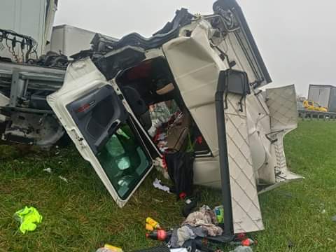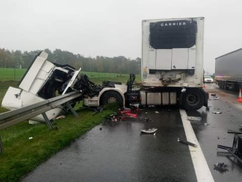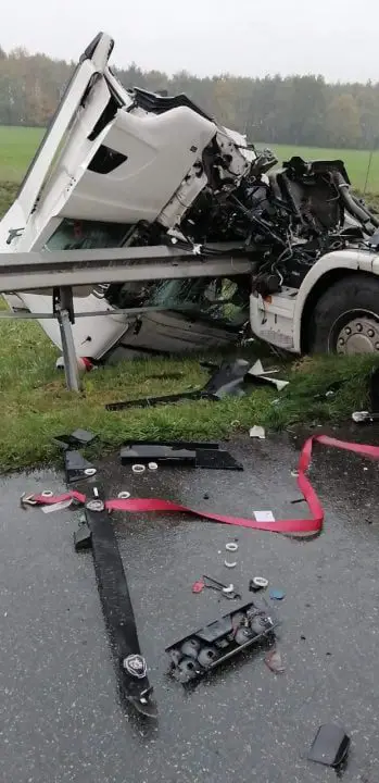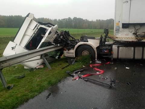 W zdarzeniu dwie osoby zostały poszkodowane to kierowca i pasażer samochodu ciężarowego w którym po uderzeniu w naczepę kabina samochodu się wyrwała.