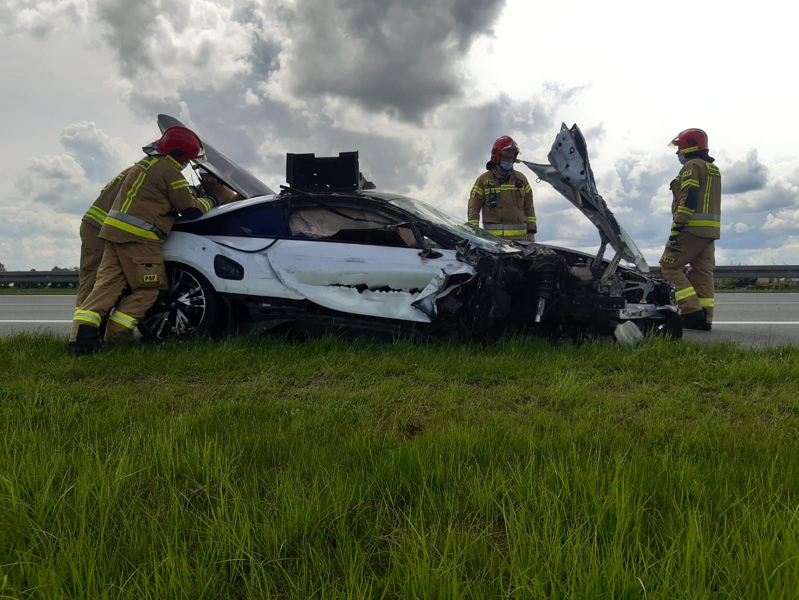 Na miejsce zadysponowano 3 zastępy z nowotomyskiej JRG oraz zastęp OSP Wąsowo. Po dojeździe pierwszych zastępów straży pożarnych na miejscu zdarzenia znajdowały się już służby autostradowe oraz zespół ratownictwa medycznego, który prowadził badanie poszkodowanego mężczyzny biorącego udział w zdarzeniu. Działania strażaków ograniczyły się do zabezpieczenia miejsca zdarzenia, odłączeniu zasilania w samochodzie osobowym o napędzie hybrydowym oraz usunięciu pojazdu na pas awaryjny celem przywrócenia drożności na autostradzie. Po przeprowadzonym badaniu uczestnik zdarzenia nie wymagał hospitalizacji i pozostał na miejscu.