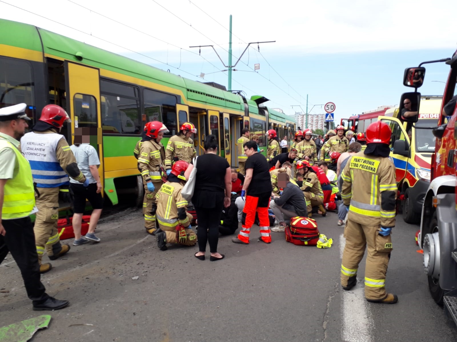 Groźny wypadek w Poznaniu. Aż 14 osób rannych. Składami podróżowało ok. 60 pasażerów. W akcji śmigłowiec Lotniczego Pogotowia Ratunkowego.