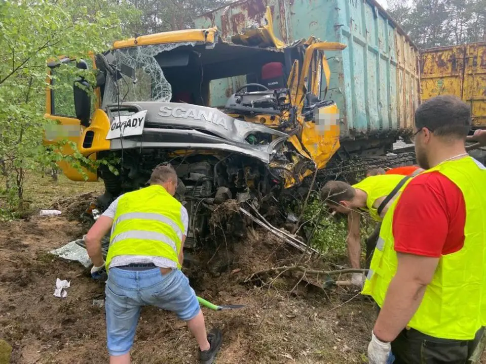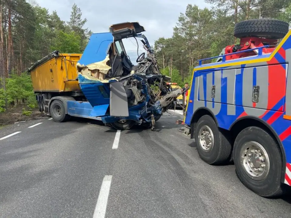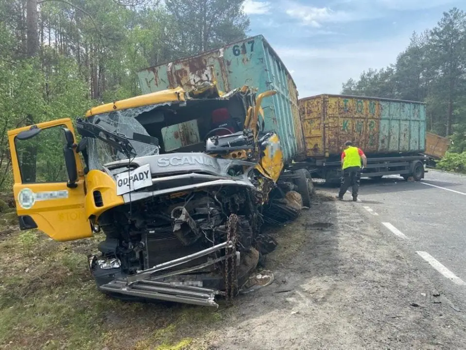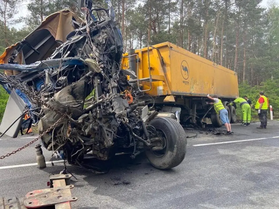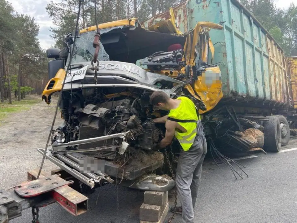 Siła zderzenia ciężarówek była potężna. Kabiny pojazdów zostały kompletnie zmiażdżone. Dookoła leżały rozsypane elementy pojazdów. Widok przerażał. Jedna z ciężarówek wypadła z drogi i przewróciła się. Druga została na drodze.