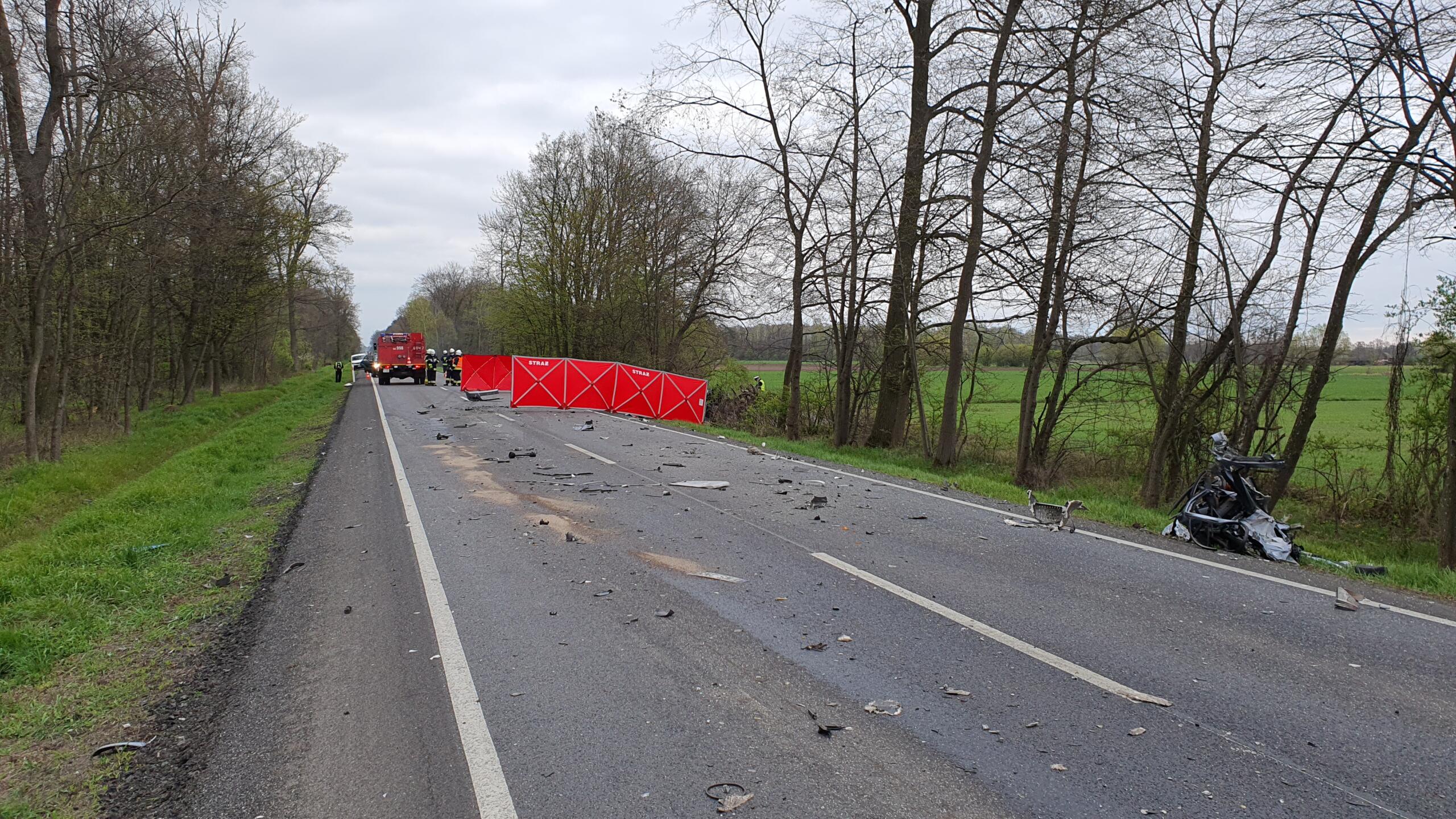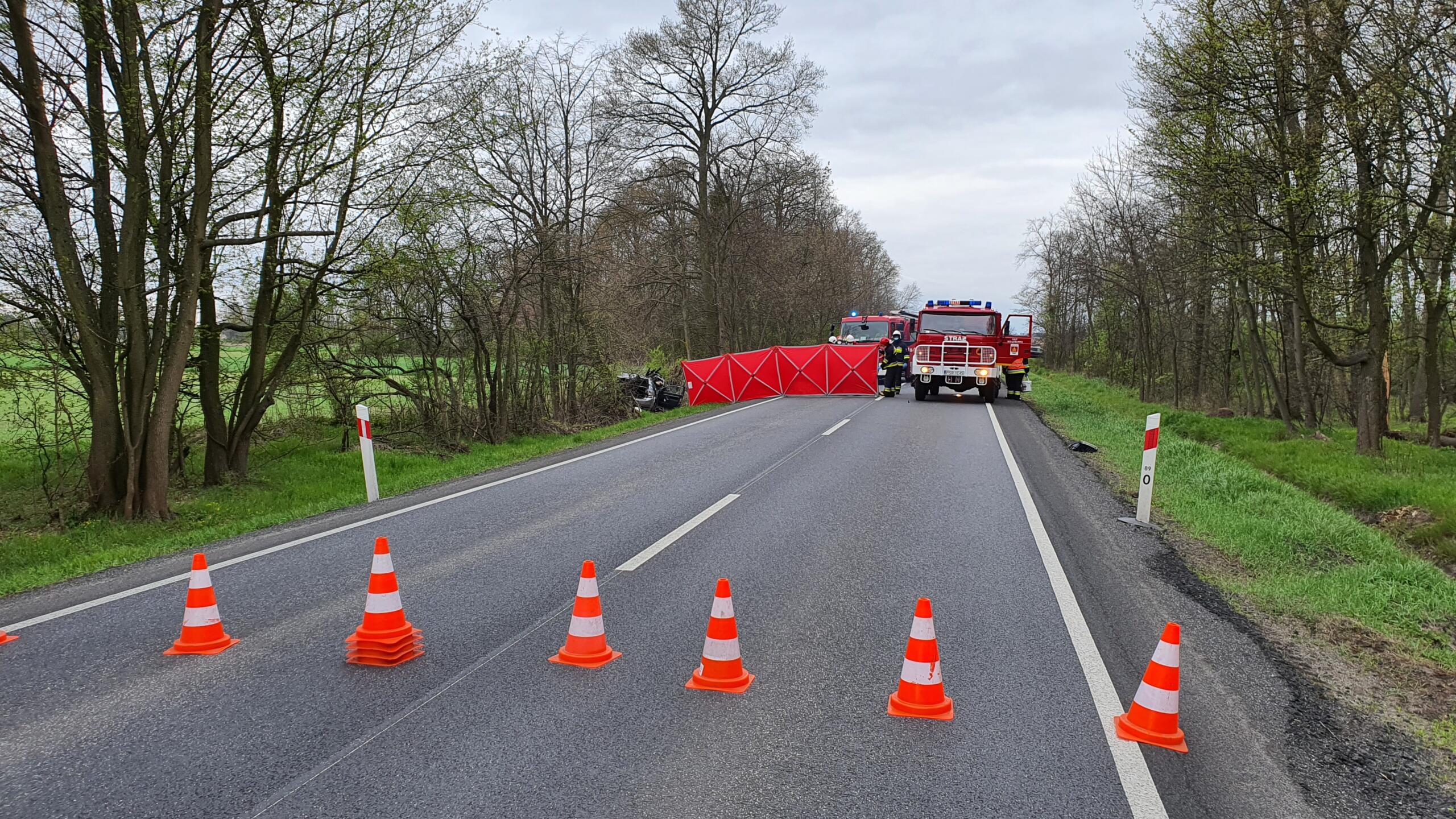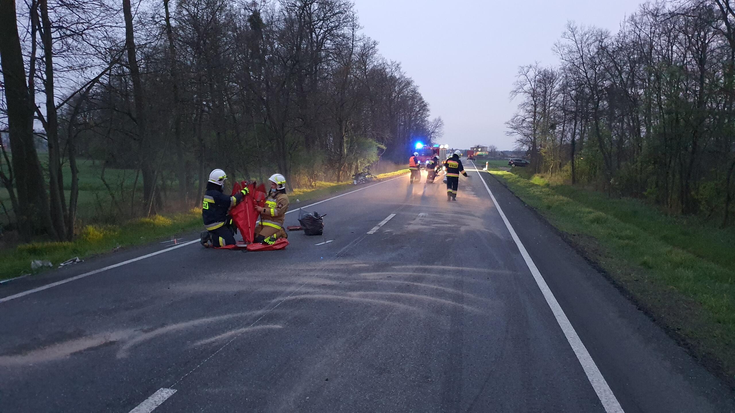 Działania strażaków przede wszystkim polegały na zabezpieczeniu terenu działań oraz przy pomocy narzędzi hydraulicznych wykonaniu dostępu do wnętrza pojazdu w celu upewnienia się czy pojazdem podróżowała tylko jedna osoba. Przybyły na miejsce Zespół Ratownictwa Medycznego niestety stwierdził zgon kobiety kierującej samochodem osobowym. Dalszy etap działań straży to kierowanie ruchem w miejscu zdarzenia, neutralizacji plam oleju oraz sprzątnięciu pozostałości powypadkowych