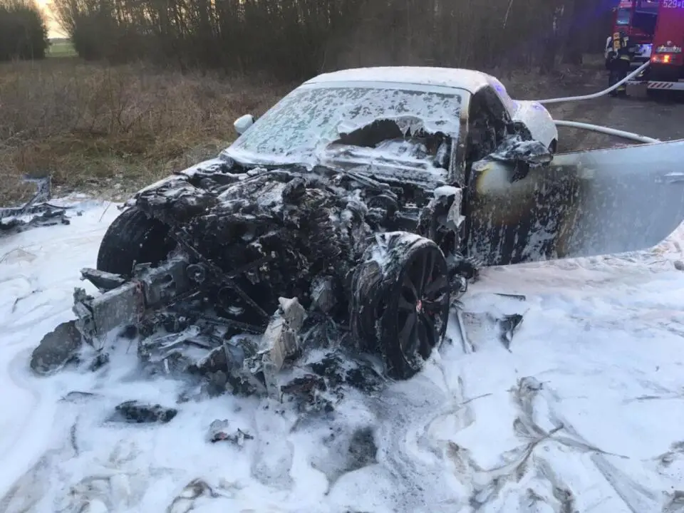 Strażacy zabezpieczyli miejsce zdarzenia i przystąpili do gaszenia samochodu przy pomocy dwóch prądów piany ciężkiej w natarciu, a następnie odłączyli akumulator do, którego musieli dostać się przy pomocy sprzętu hydraulicznego. Na końcu sprawdzono pojazd kamerą termowizyjną, która nie wykryła zagrożenia.